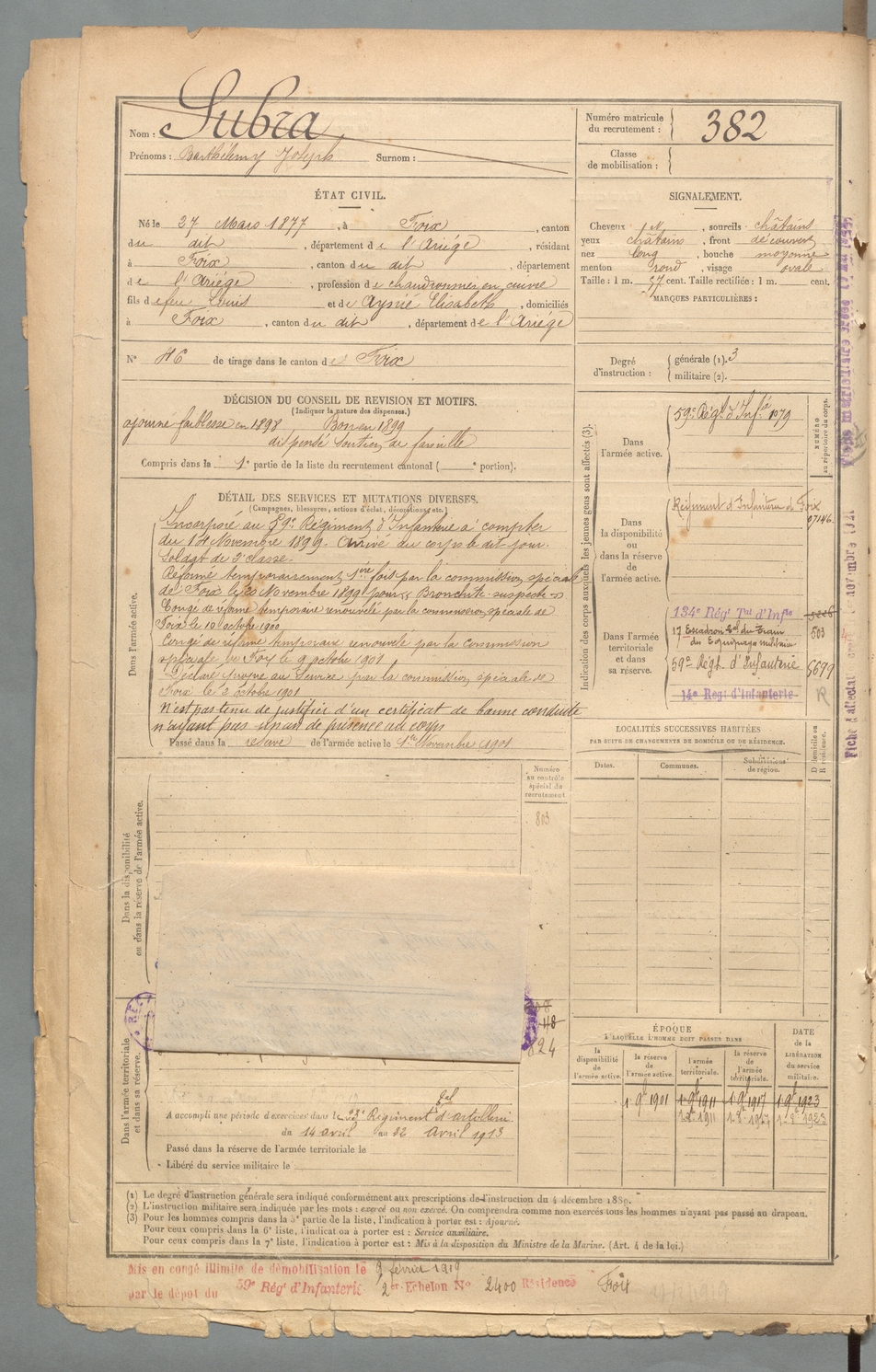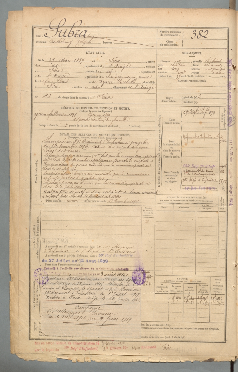 | Subra | Barthélemy Joseph | FOIX | 1 R 450 | 1897 | Foix | Foix | 382 |