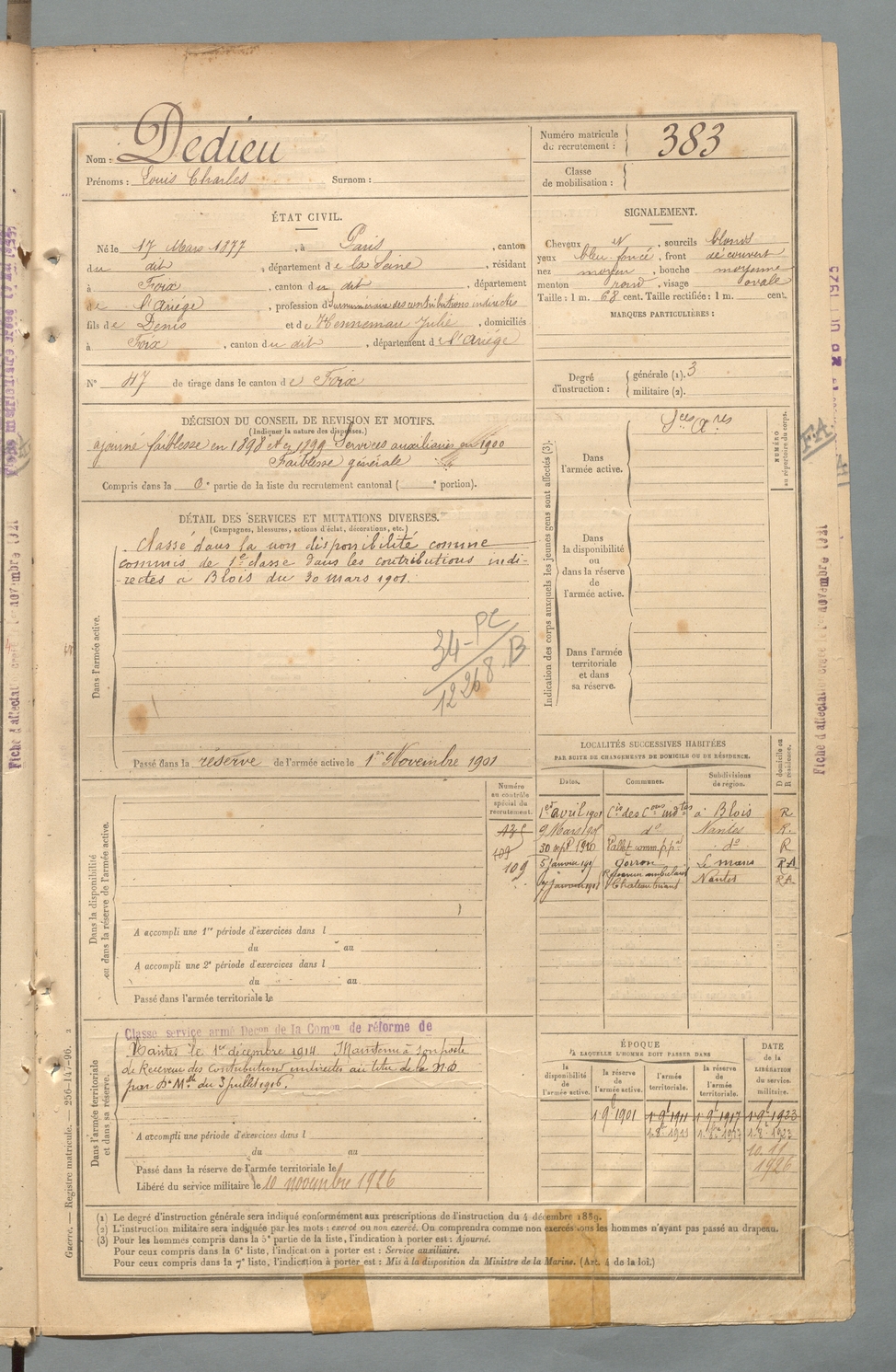 | Dedieu | Louis Charles | FOIX | 1 R 450 | 1897 | Paris | Foix | 383 |