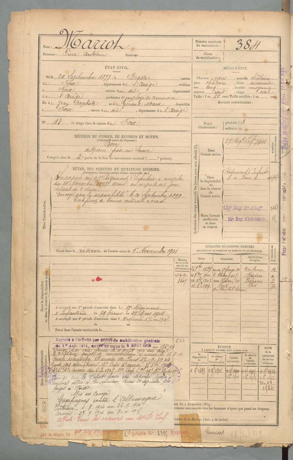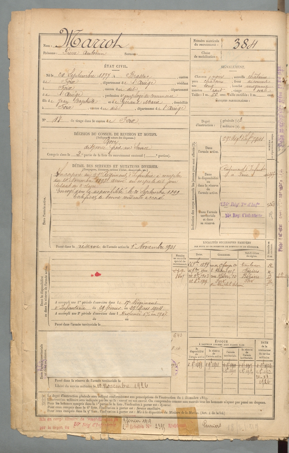 | Marrot | Pierre Antonin | FOIX | 1 R 450 | 1897 | Brassac | Foix | 384 |