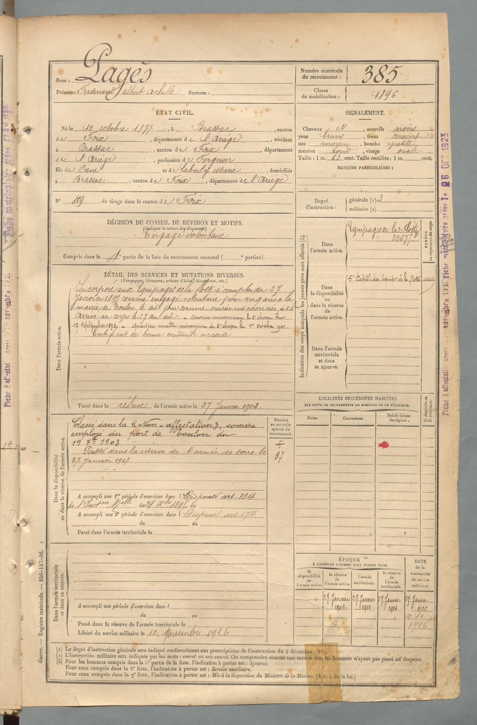 | Pagès | Ferdinand Albert Achille | FOIX | 1 R 450 | 1897 | Brassac | Brassac | 385 |