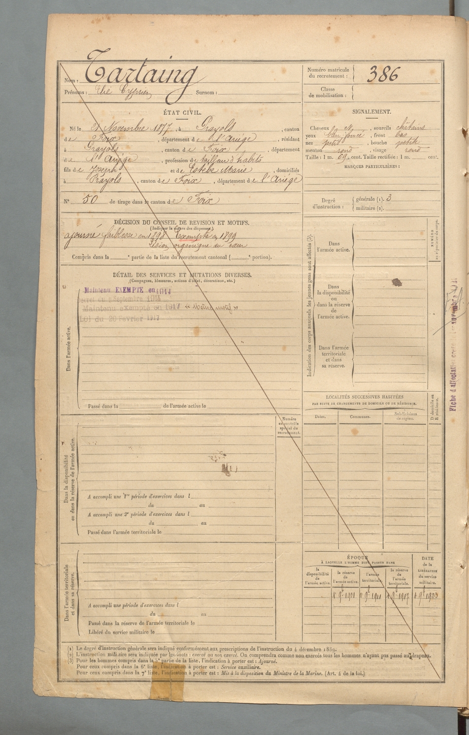 | Tartaing | Elie Cyprien | FOIX | 1 R 450 | 1897 | Prayols | Prayols | 386 |