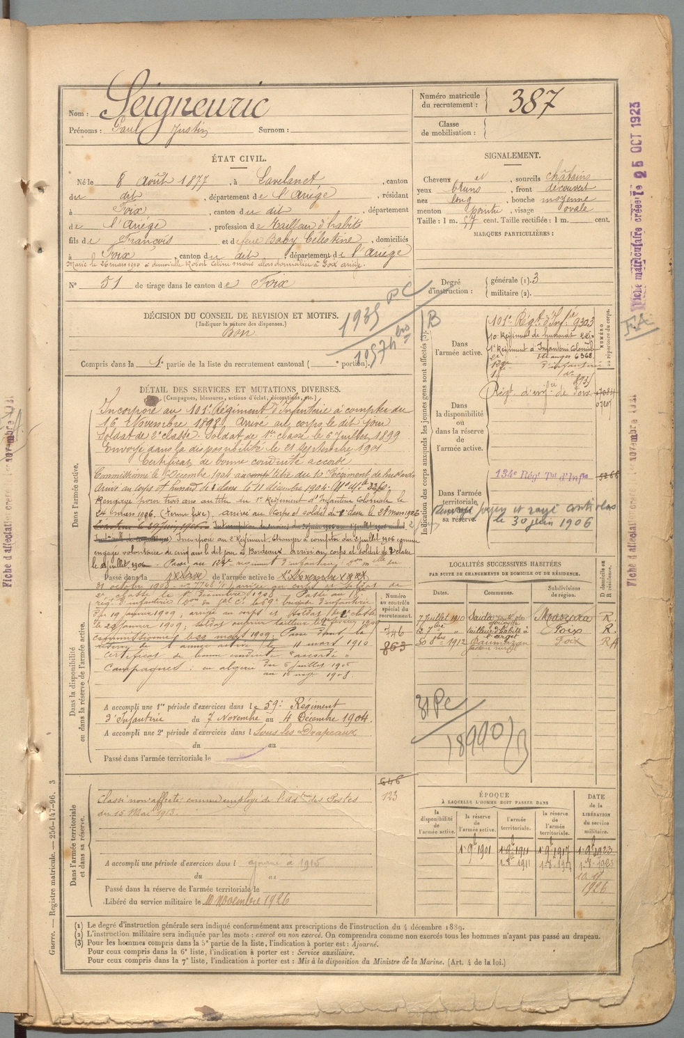 | Seigneuric | Paul Justin | FOIX | 1 R 450 | 1897 | Lavelanet | Foix | 387 |