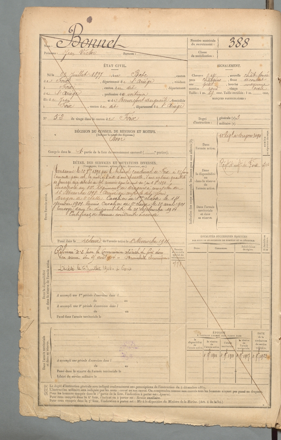 | Bonnet | Jean Victor | FOIX | 1 R 450 | 1897 | Bosc (Le) | Foix | 388 |