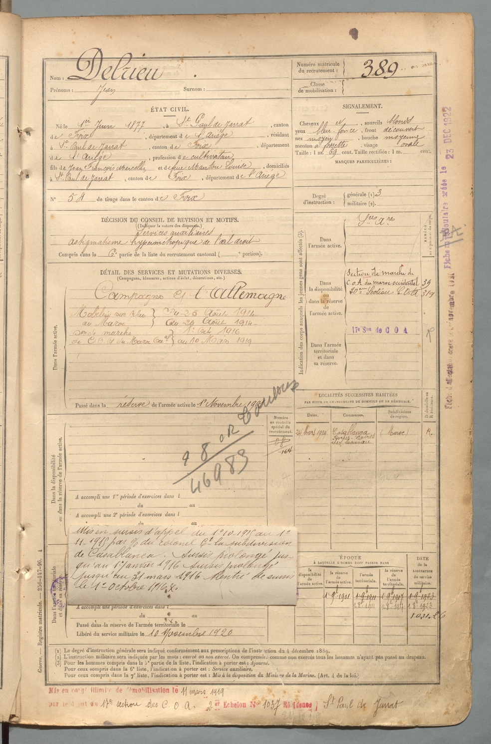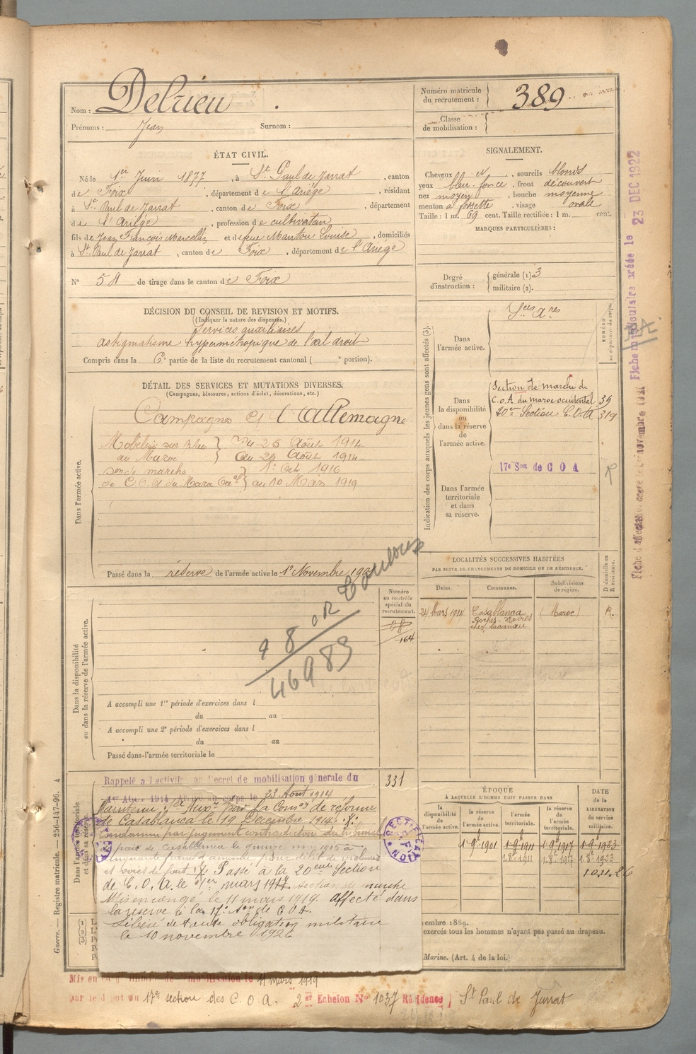 | Delrieu | Jean | FOIX | 1 R 450 | 1897 | Saint-Paul-de-Jarrat | Saint-Paul-de-Jarrat | 389 |