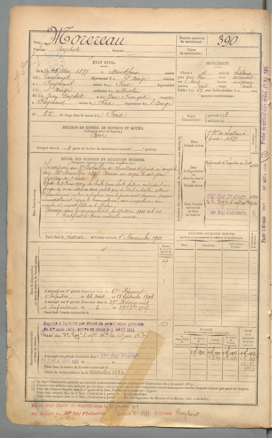 | Morereau | Baptiste | FOIX | 1 R 450 | 1897 | Montferrier | Freychenet | 390 |
