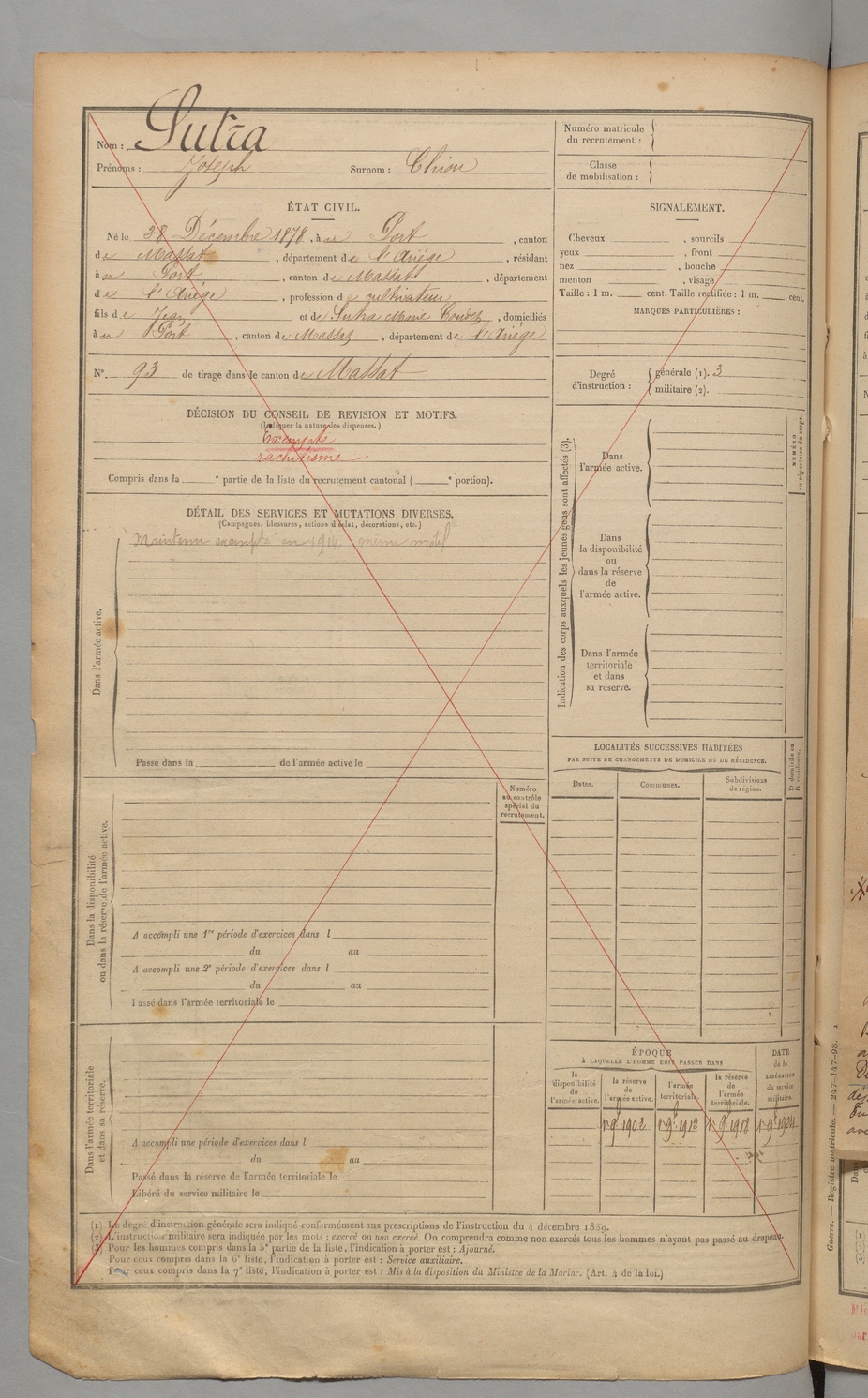 | Sutra | Joseph dit Chiou | FOIX | 1 R 454 | 1898 | PoRt (Le) | Port (Le) | 3014 |