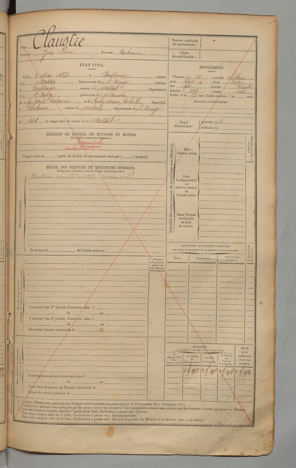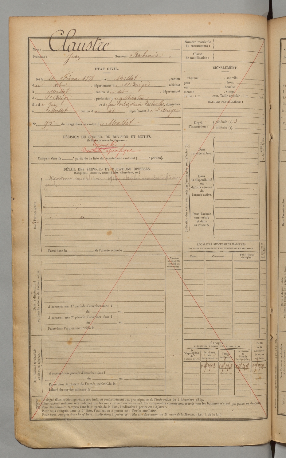 | Claustre | Jean dit Barbanère | FOIX | 1 R 454 | 1898 | Massat | Massat | 3015 |