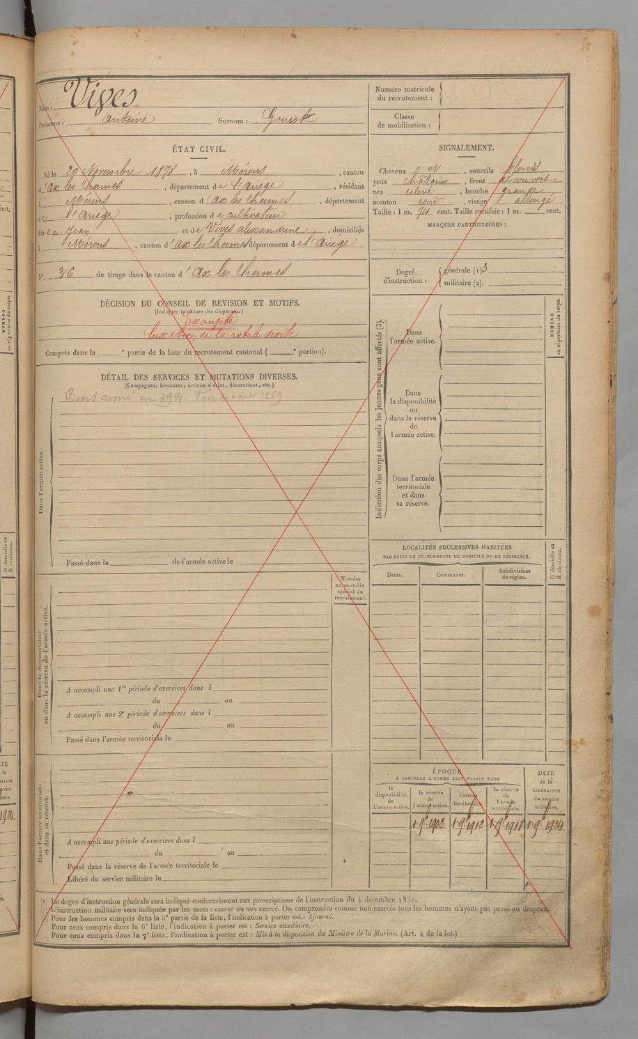 | Vivies | Antoine dit Gouiste | FOIX | 1 R 454 | 1898 | MéRens-les-Vals | Mérens-les-Vals | 3033 |
