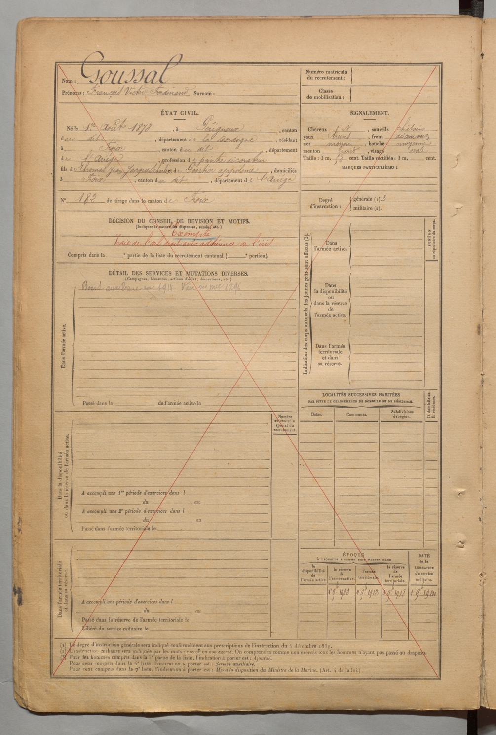 | Goussal | François Victor Ferdinand | FOIX | 1 R 455 | 1898 | PéRigueux | Foix | 3034 |