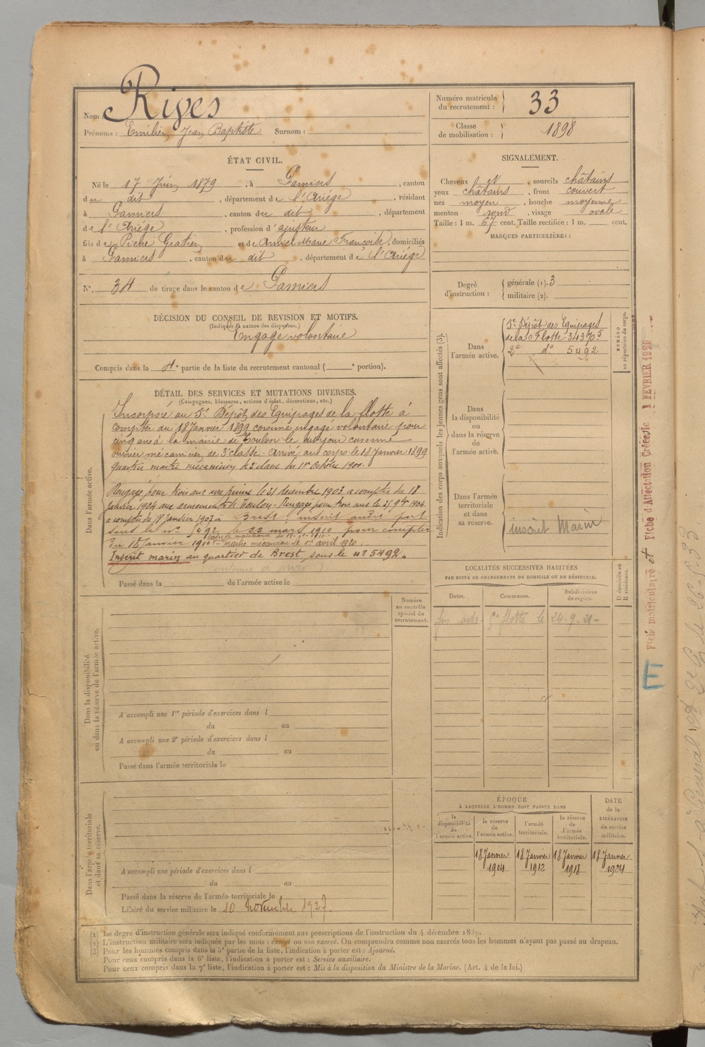 | Rives | Emilien Jean Baptiste | FOIX | 1 R 456 | 1899 | Pamiers | Pamiers | 33 |