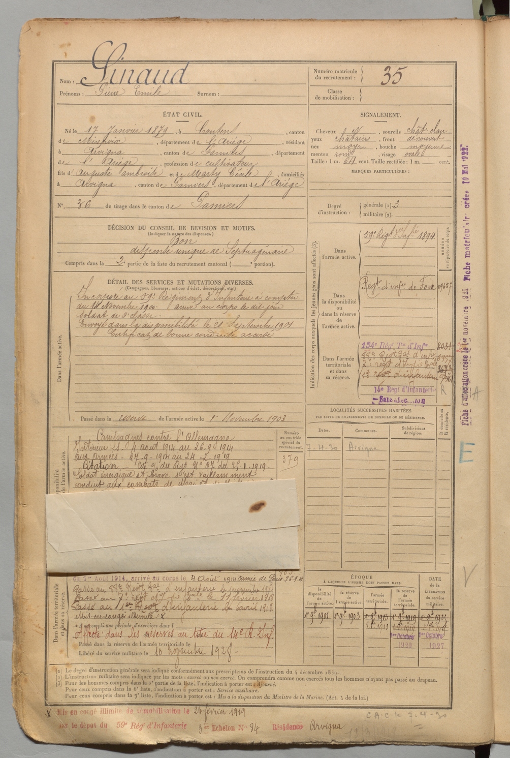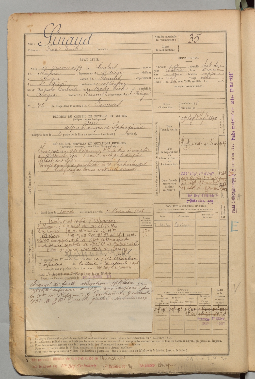 | Sinaud | Pierre Emile | FOIX | 1 R 456 | 1899 | Coutens | Arvigna | 35 |