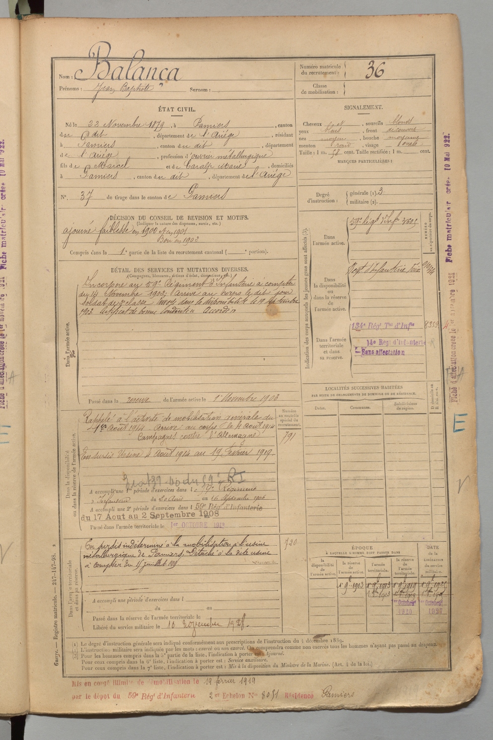 | Balança | Jean Baptiste | FOIX | 1 R 456 | 1899 | Pamiers | Pamiers | 36 |