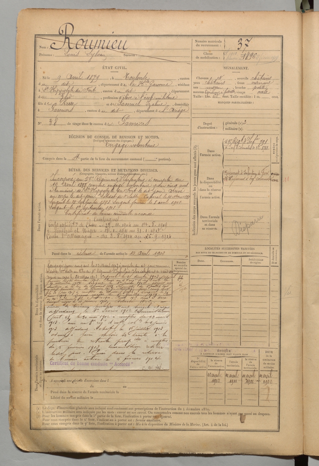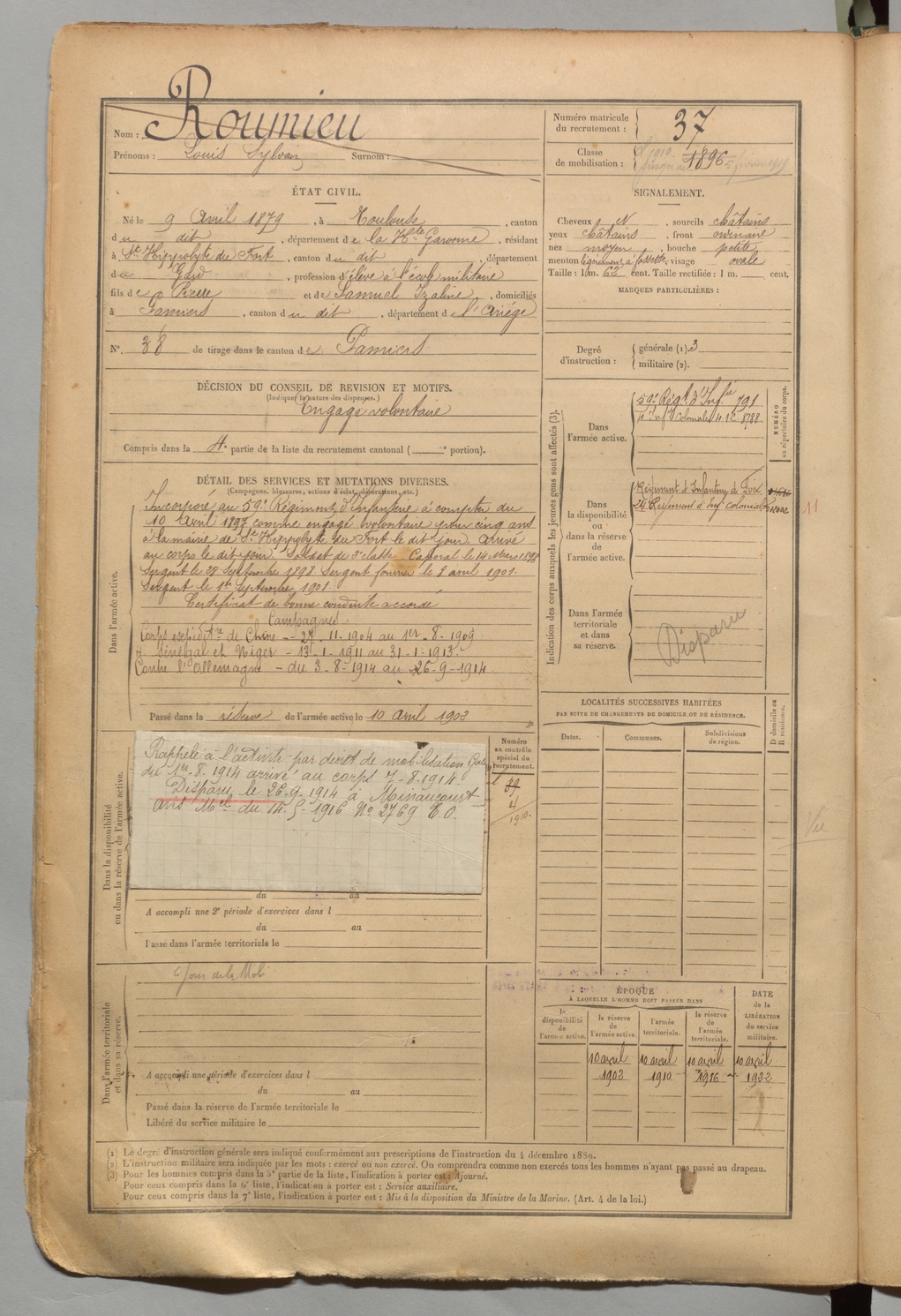 | Roumieu | Louis Sylvain | FOIX | 1 R 456 | 1899 | Toulouse | Saint Hippolyte du Fort | 37 |