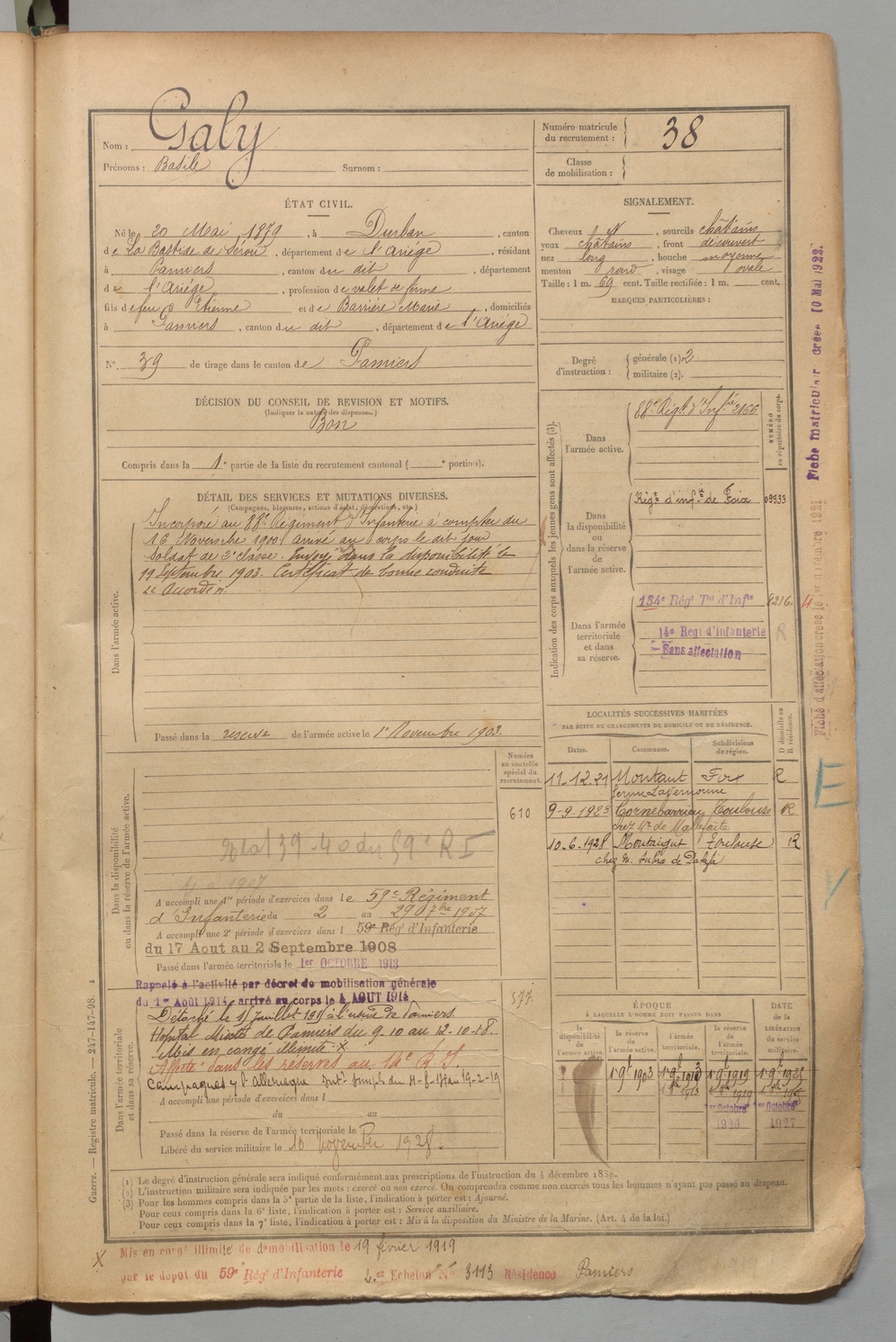 | Galy | Basile | FOIX | 1 R 456 | 1899 | Durban-sur-Arize | Pamiers | 38 |