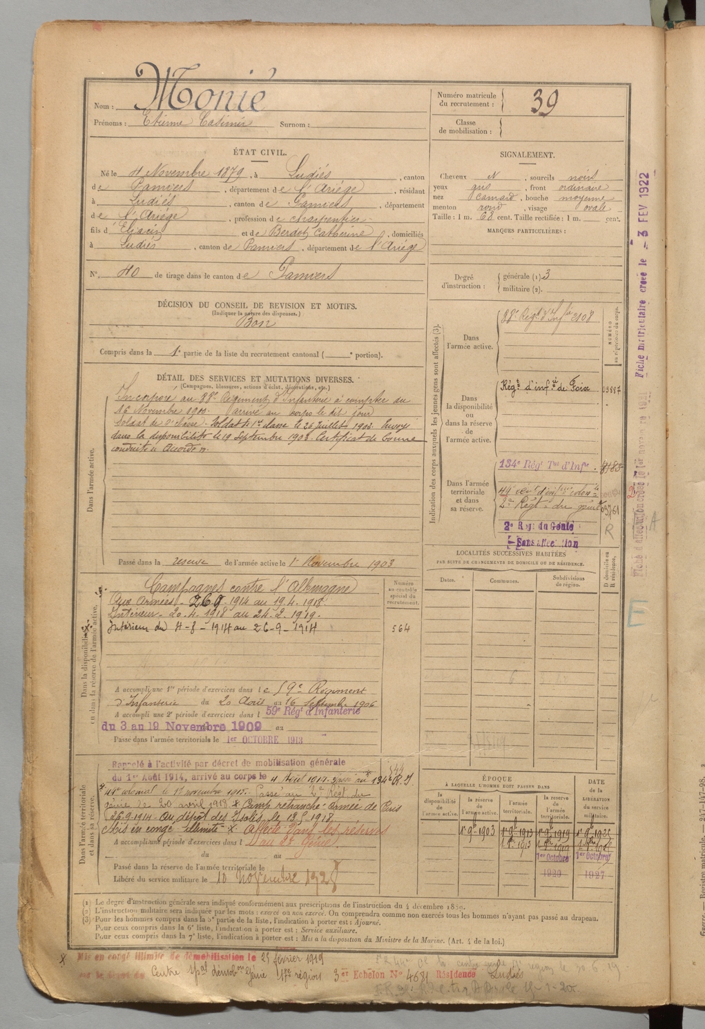 | Monié | Etienne Casimir | FOIX | 1 R 456 | 1899 | Ludiès | Ludiès | 39 |