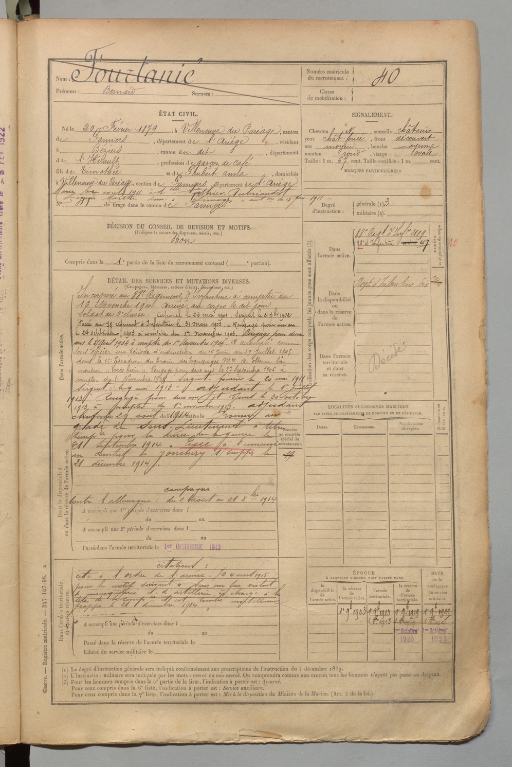 | Fourtanié | Bernard | FOIX | 1 R 456 | 1899 | Villeneuve-du-Paréage | Béziers | 40 |
