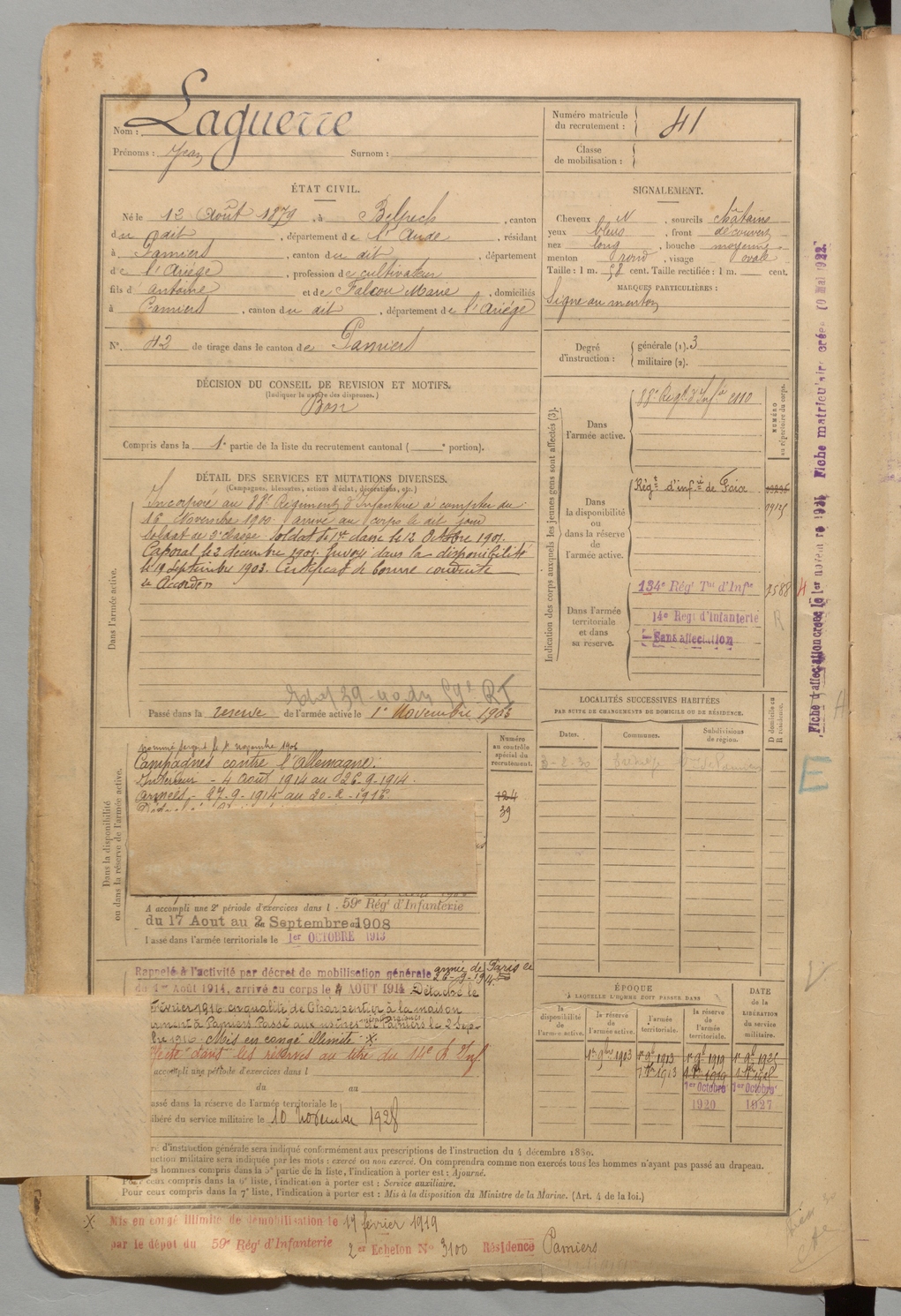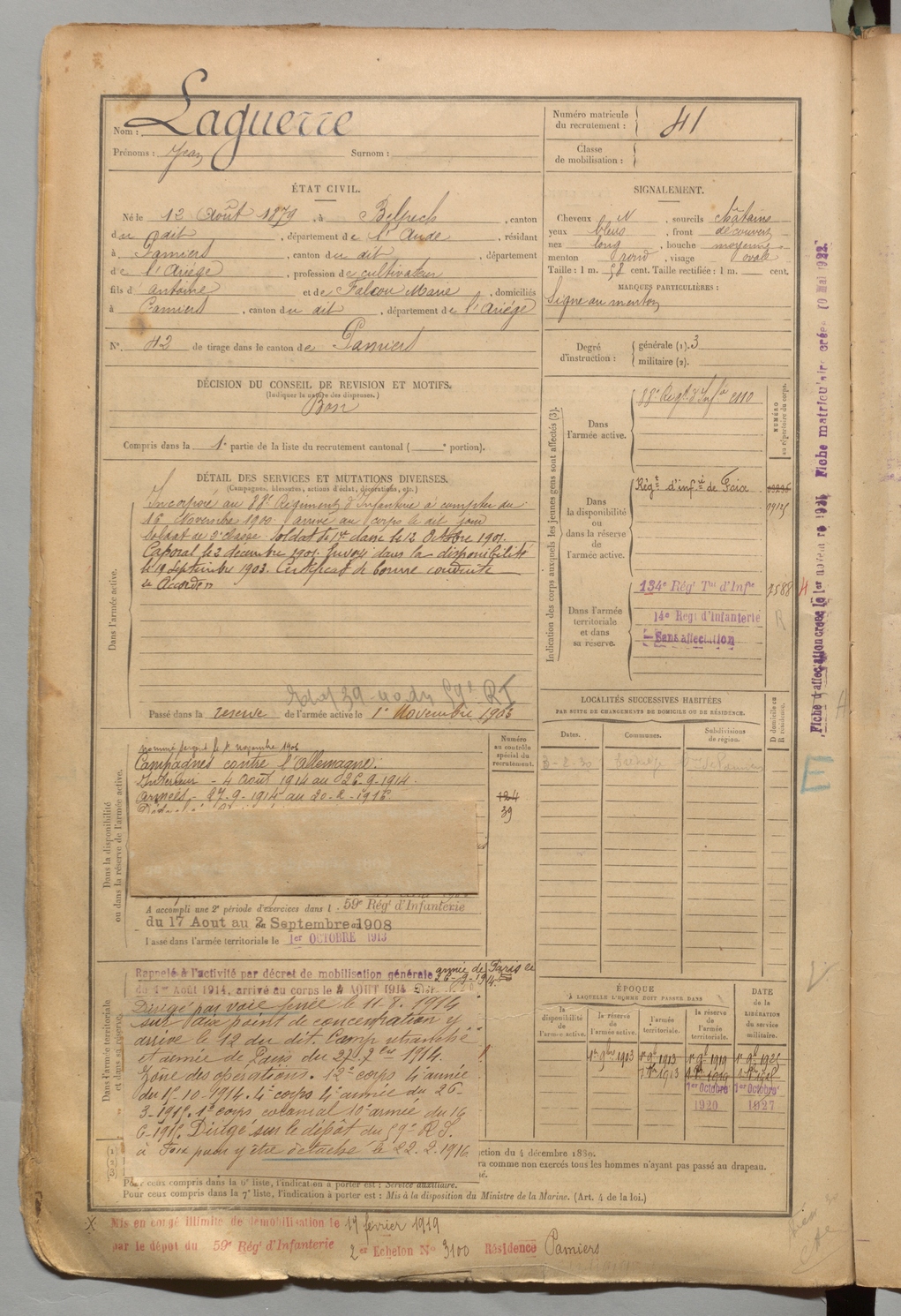 | Laguerre | Jean | FOIX | 1 R 456 | 1899 | Belpech | Pamiers | 41 |