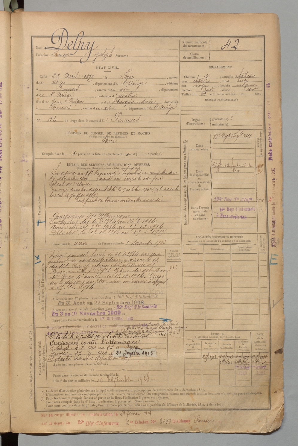 | Delpy | François Joseph | FOIX | 1 R 456 | 1899 | Foix | Pamiers | 42 |