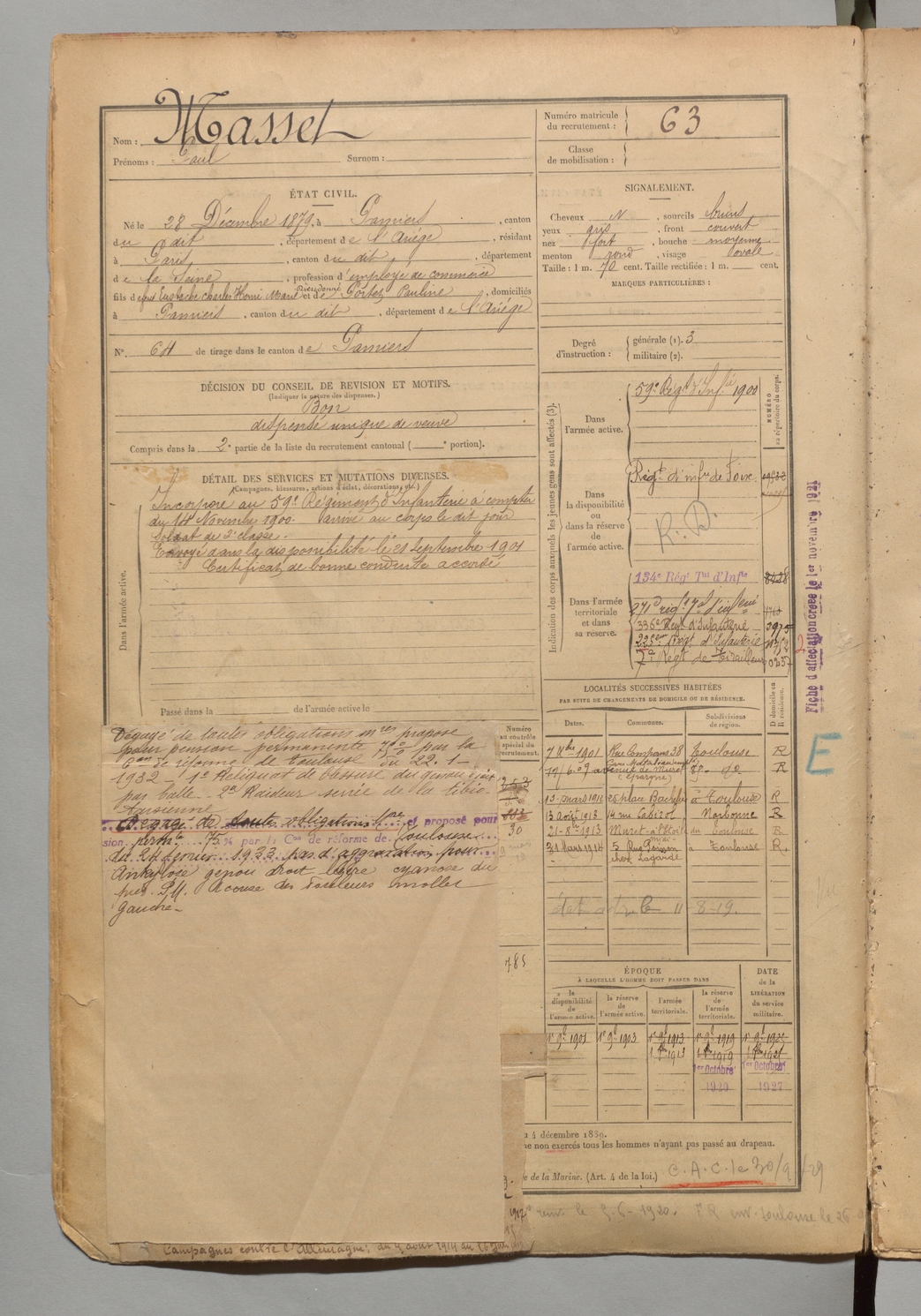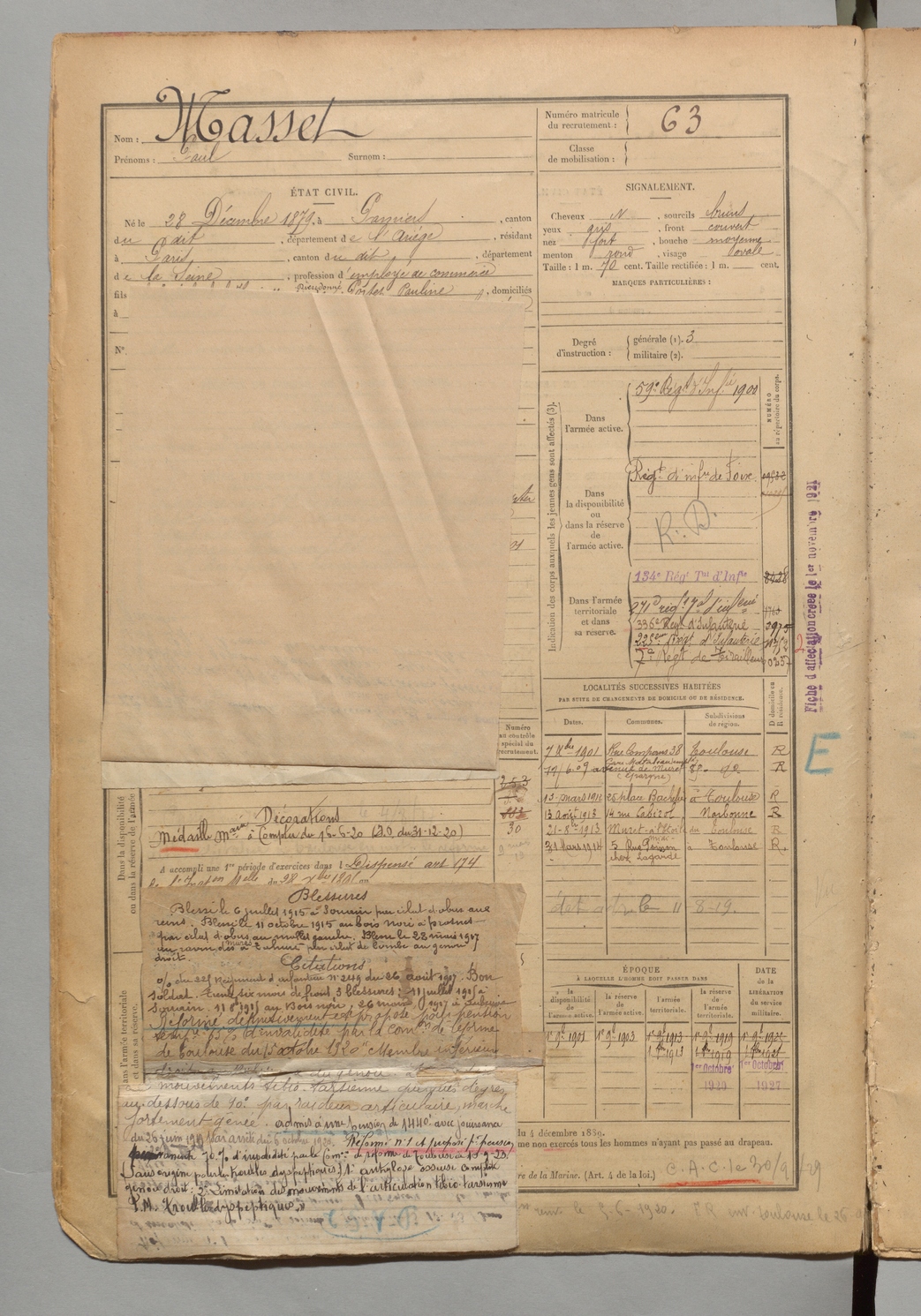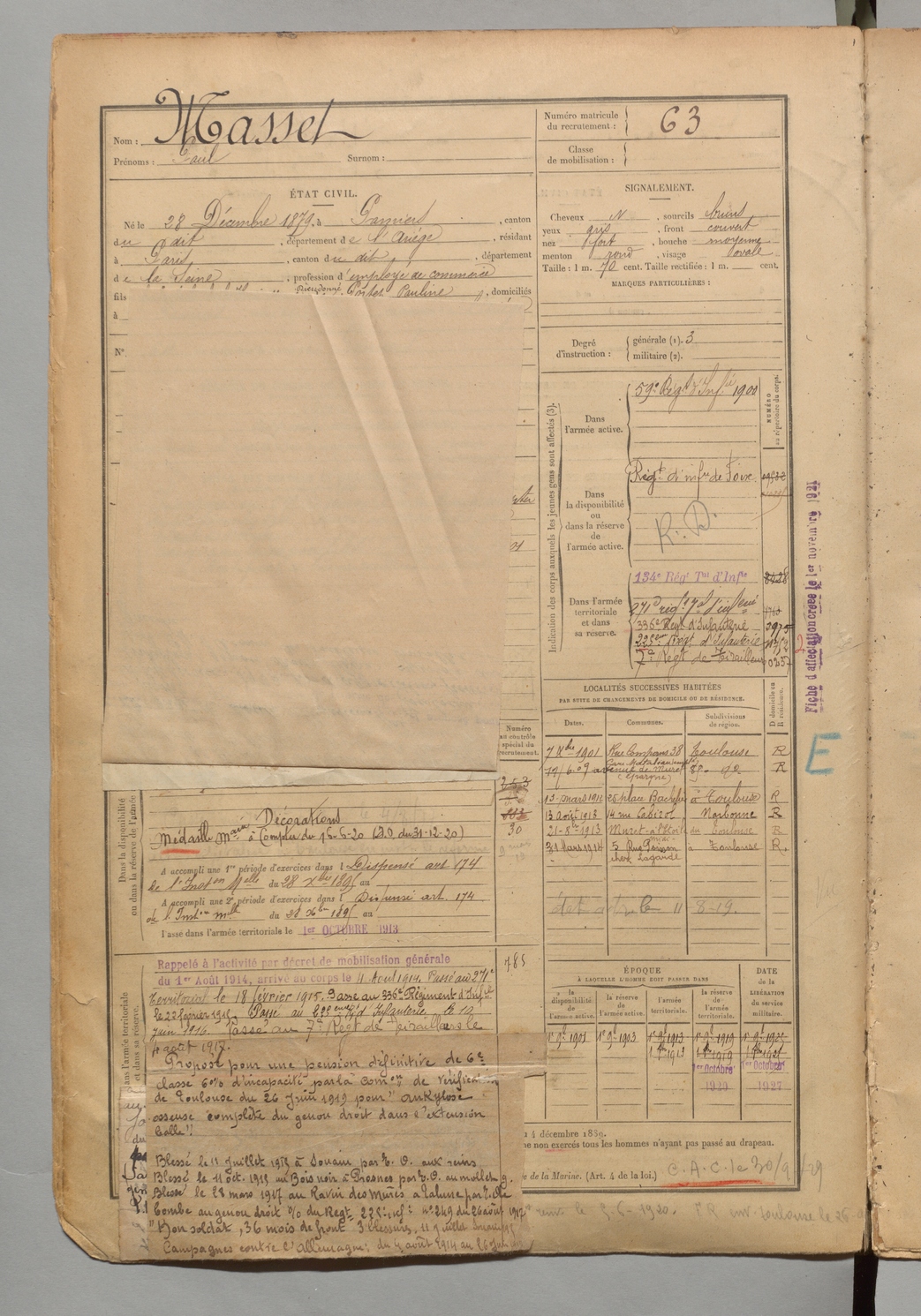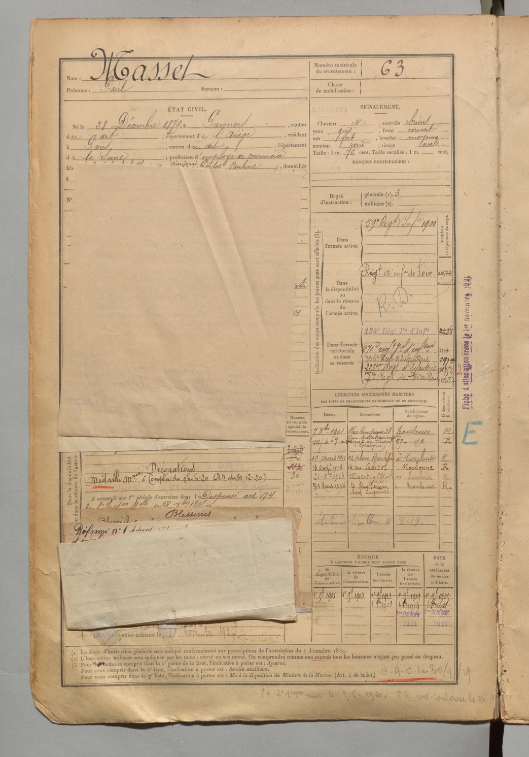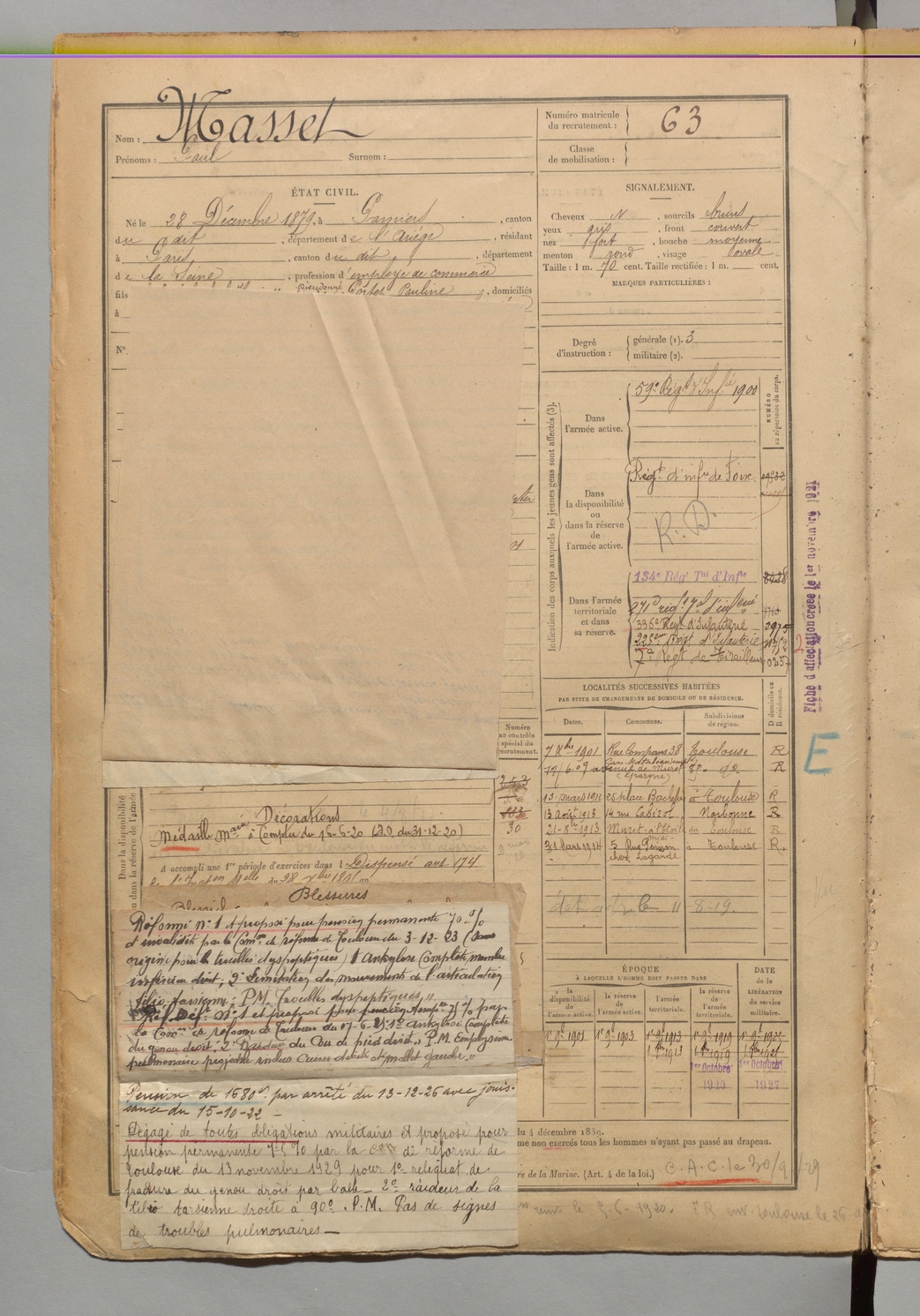 | Masset | Paul | FOIX | 1 R 456 | 1899 | Pamiers | Paris | 63 |