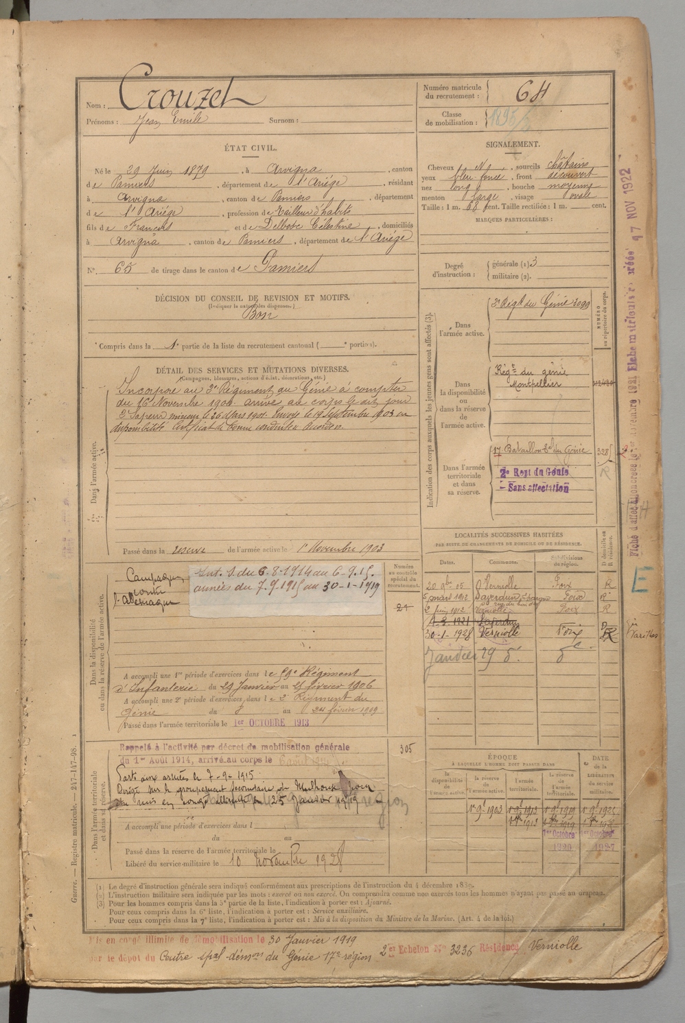 | Crouzet | Jean Emile | FOIX | 1 R 456 | 1899 | Arvigna | Arvigna | 64 |