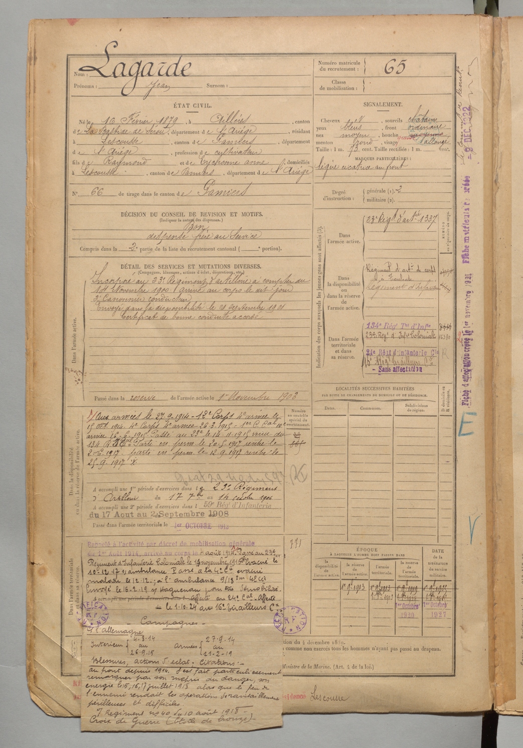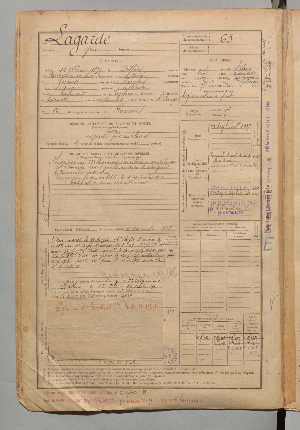 | Lagarde | Jean | FOIX | 1 R 456 | 1899 | Allières | Lescousse | 65 |
