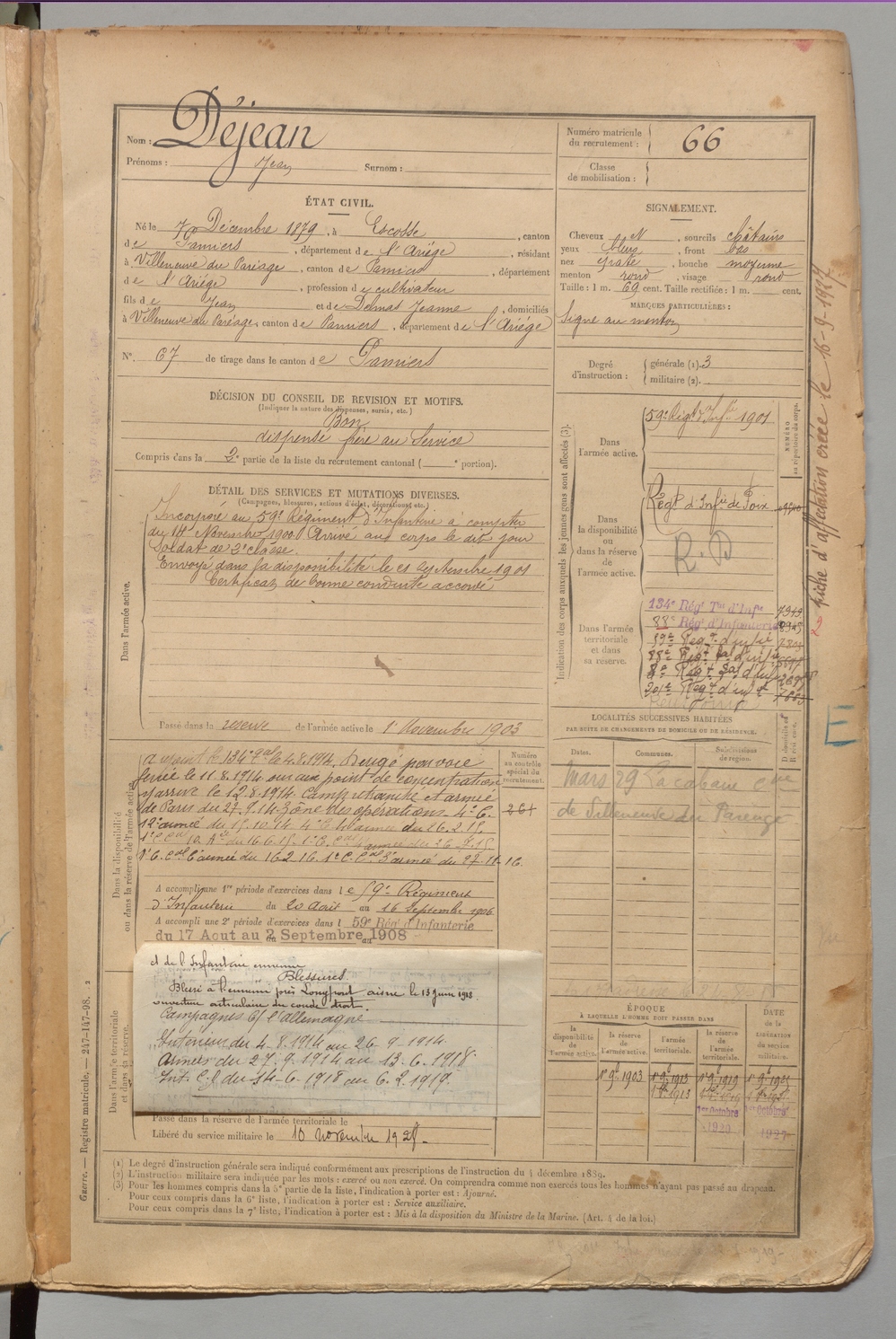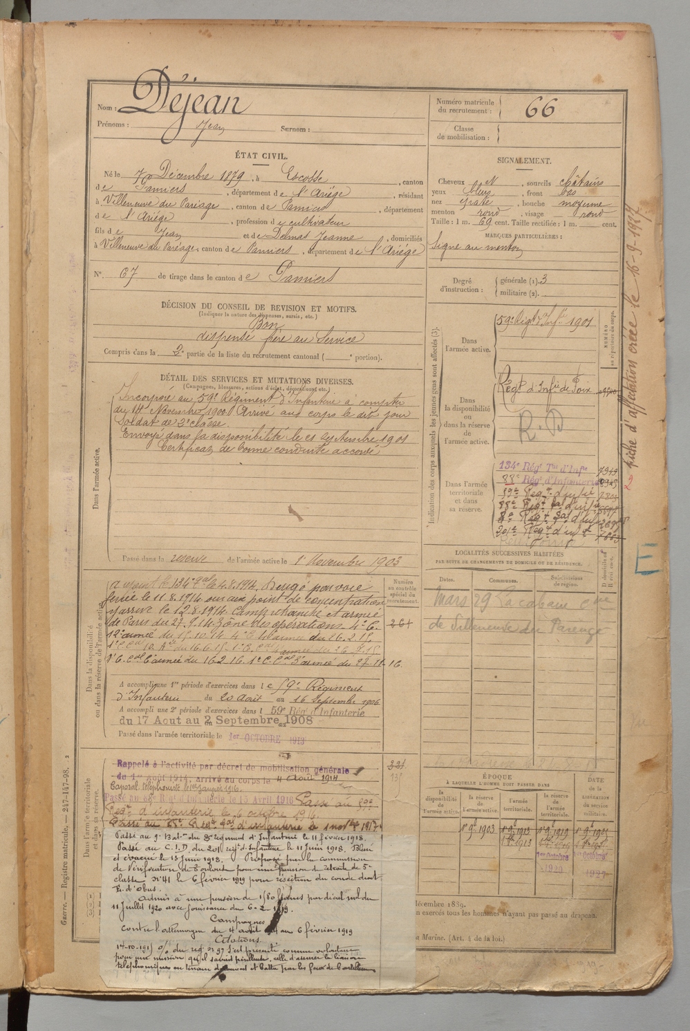 | Déjean | Jean | FOIX | 1 R 456 | 1899 | Escosse | Villeneuve-du-Paréage | 66 |