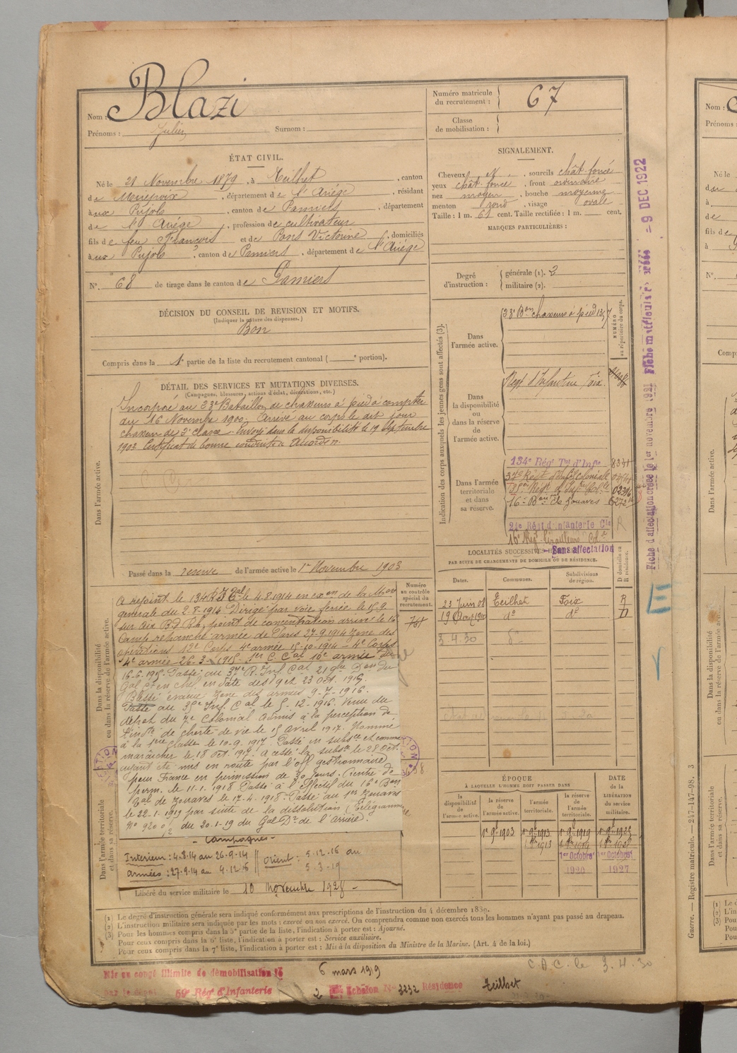 | Blazi | Julien | FOIX | 1 R 456 | 1899 | Teilhet | Pujols (les) | 67 |