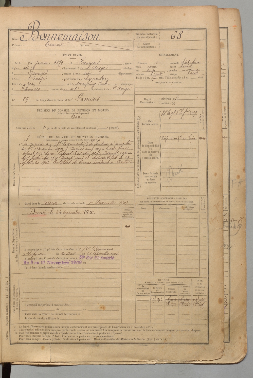 | Bonnemaison | Bernard | FOIX | 1 R 456 | 1899 | Pamiers | Pamiers | 68 |