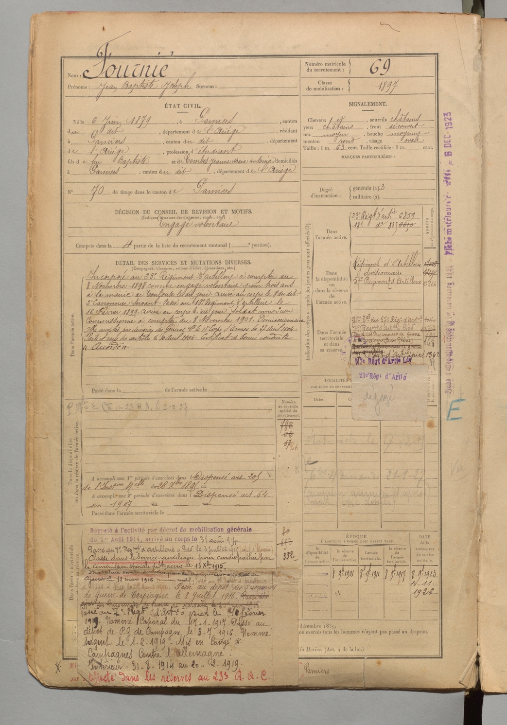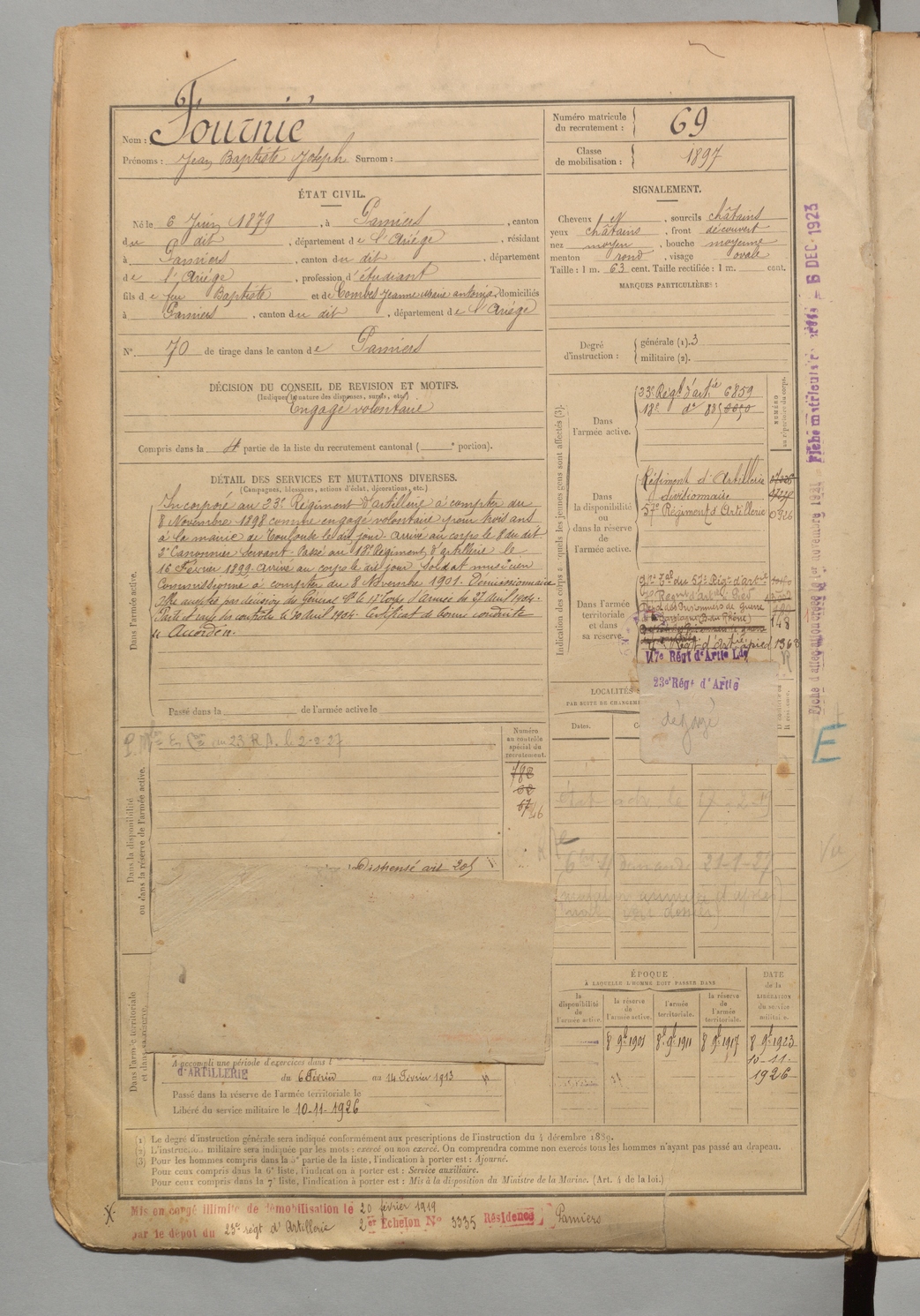 | Fournié | Jean Baptiste Joseph | FOIX | 1 R 456 | 1899 | Pamiers | Pamiers | 69 |
