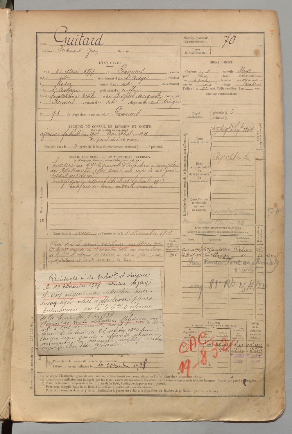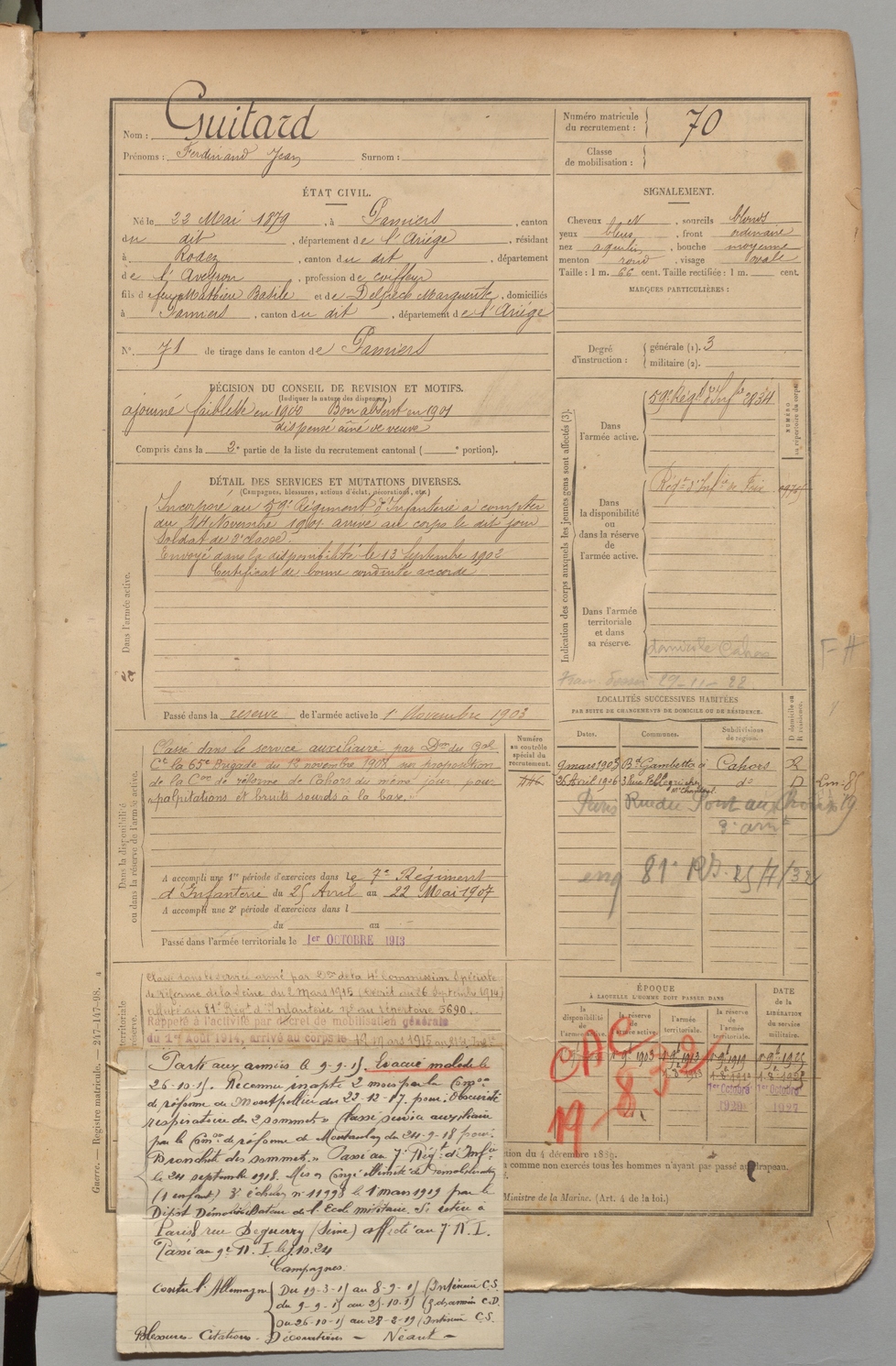 | Guitard | Ferdinand Jean | FOIX | 1 R 456 | 1899 | Pamiers | Rodez | 70 |