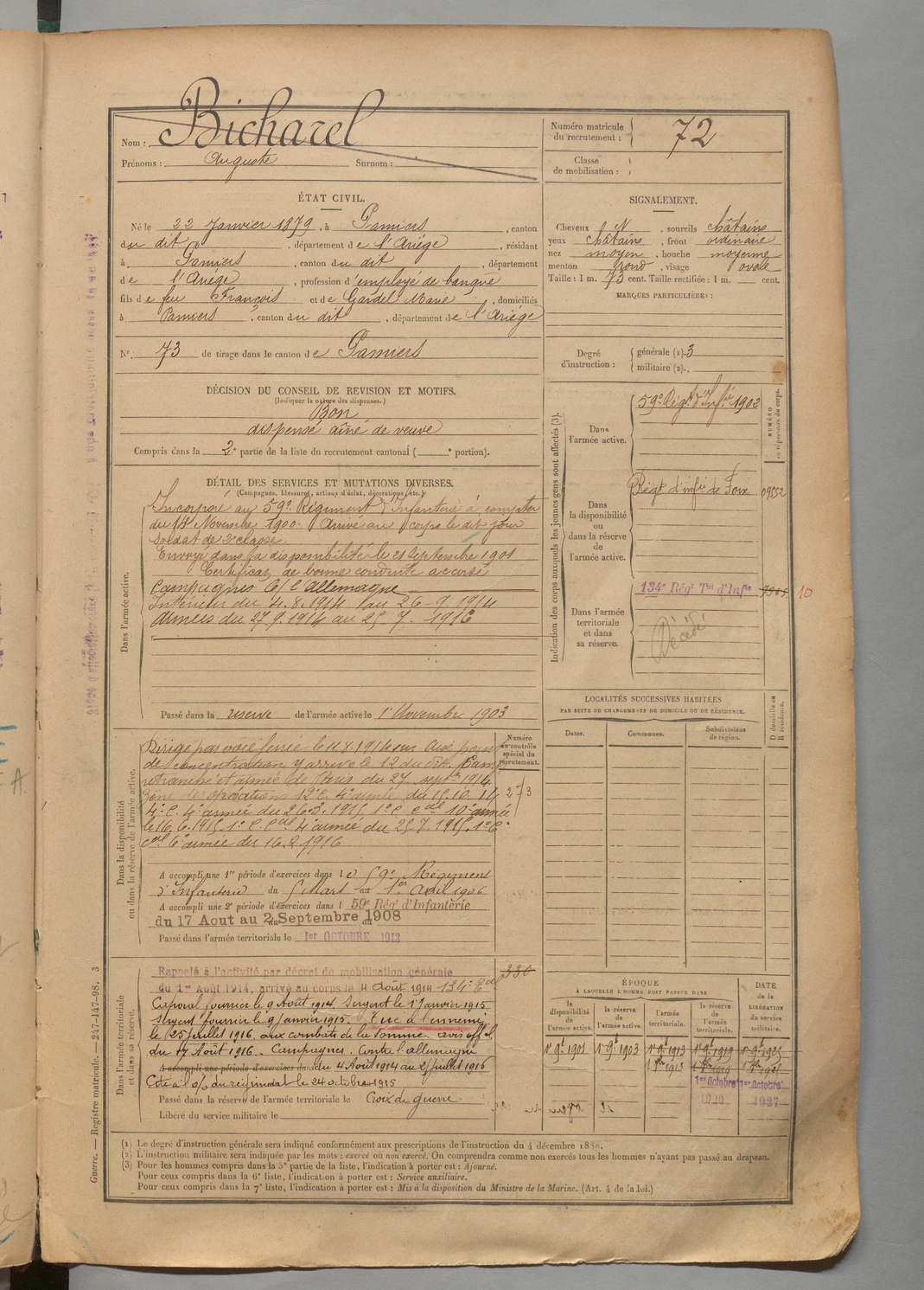 | Bicharel | Auguste | FOIX | 1 R 456 | 1899 | Pamiers | Pamiers | 72 |