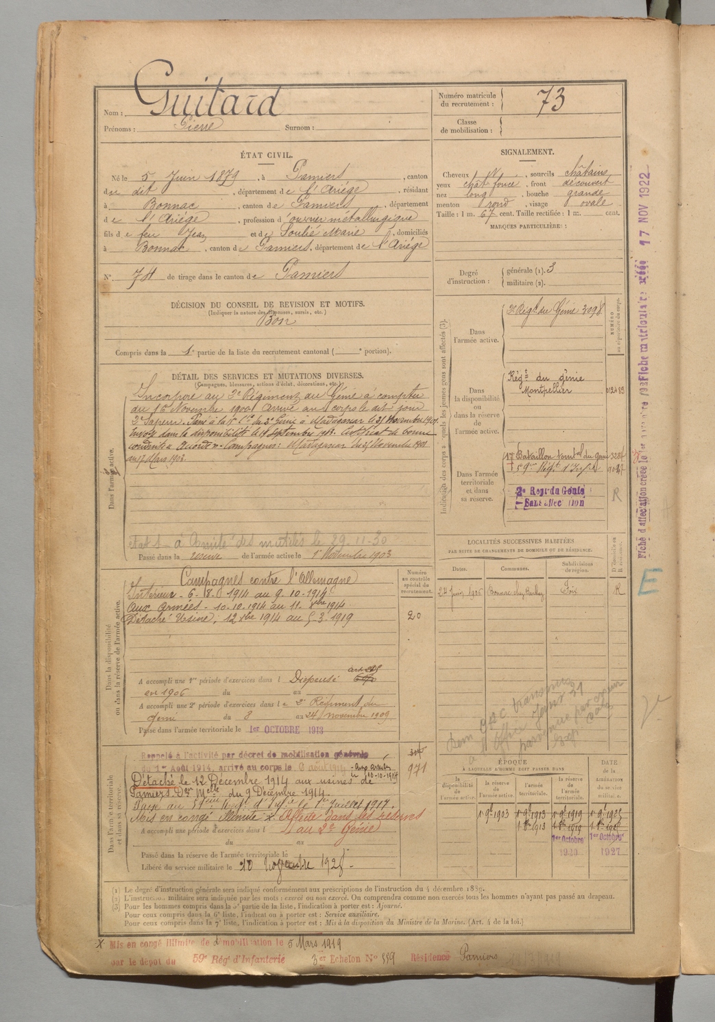 | Guitard | Pierre | FOIX | 1 R 456 | 1899 | Pamiers | Bonnac | 73 |