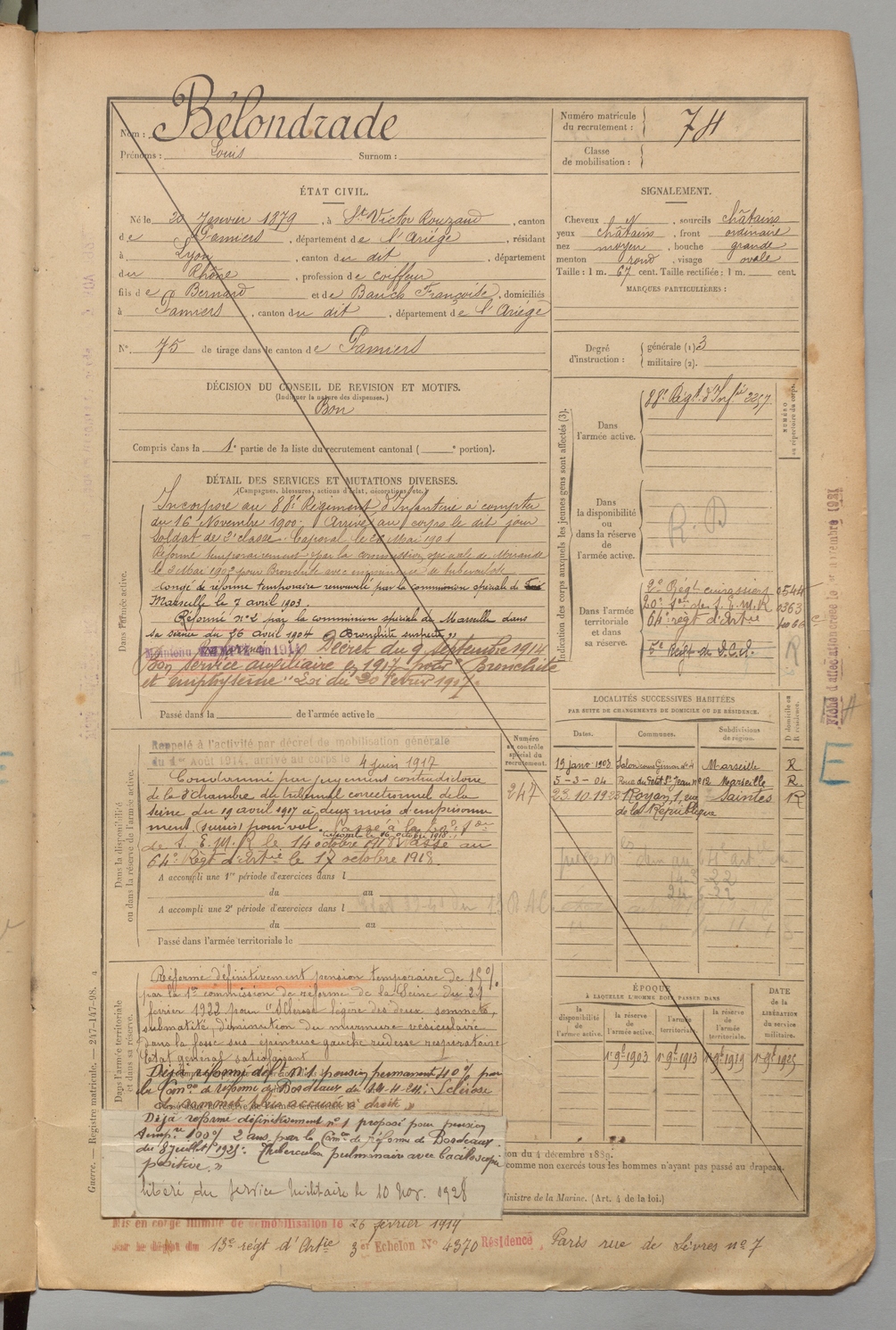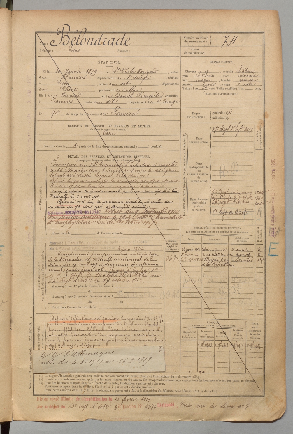 | Bélondrade | Louis | FOIX | 1 R 456 | 1899 | Saint-Victor-Rouzaud | Lyon | 74 |