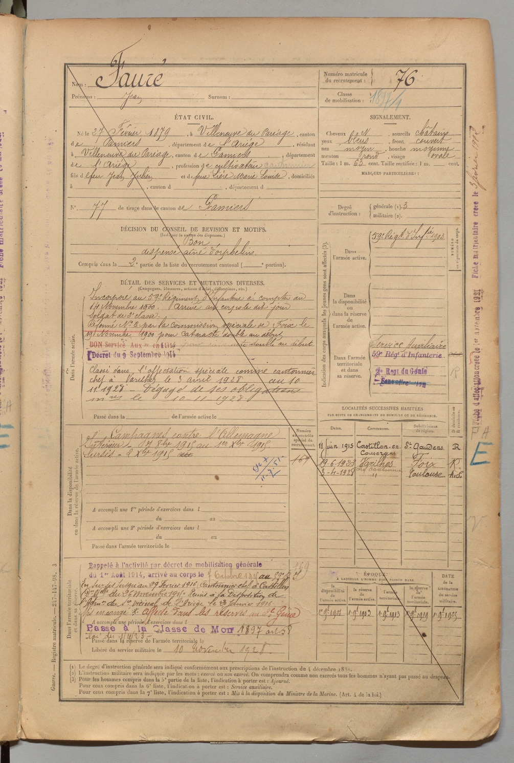 | Fauré | Jean | FOIX | 1 R 456 | 1899 | Villeneuve-du-Paréage | Villeneuve-du-Paréage | 76 |