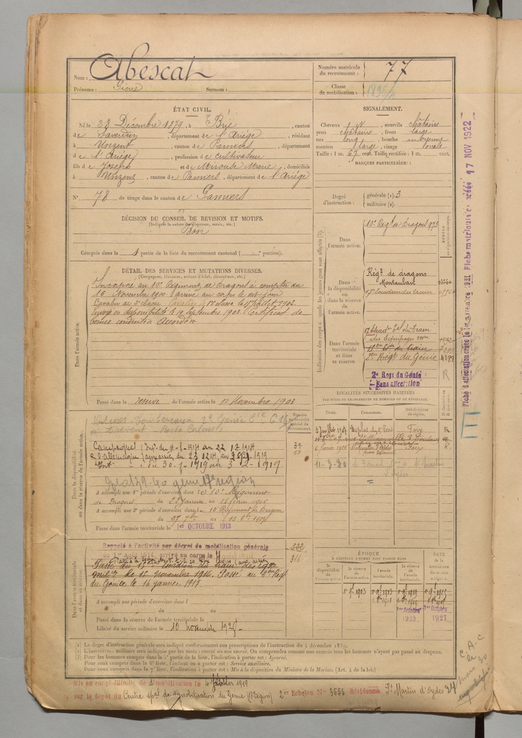 | Abescat | Pierre | FOIX | 1 R 456 | 1899 | Brie | Unzent | 77 |