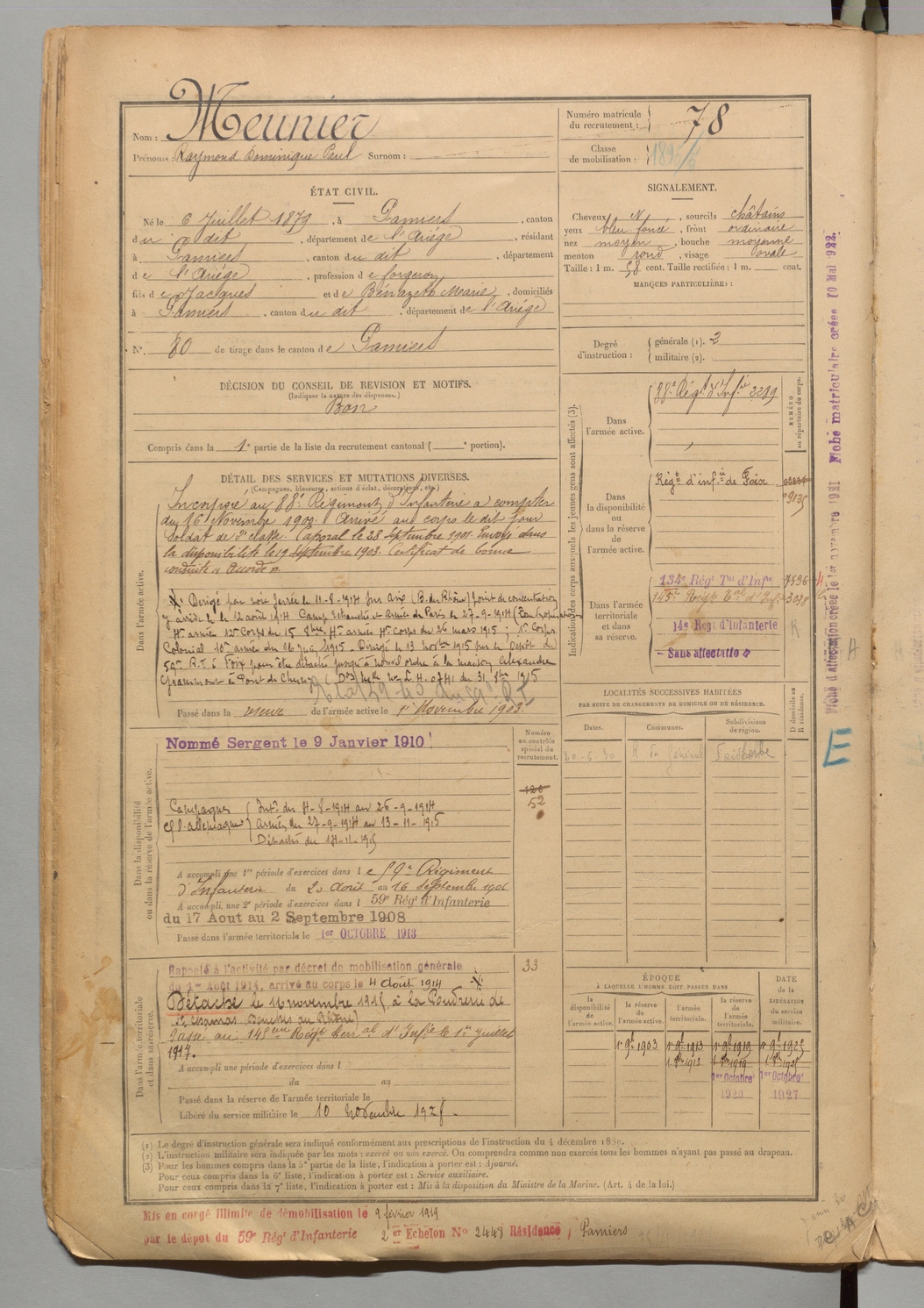 | Meunier | Raymond Dominique Paul | FOIX | 1 R 456 | 1899 | Pamiers | Pamiers | 78 |