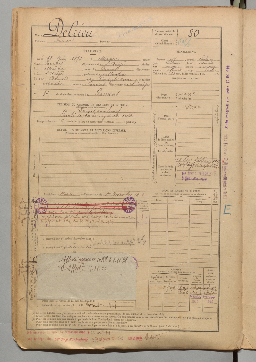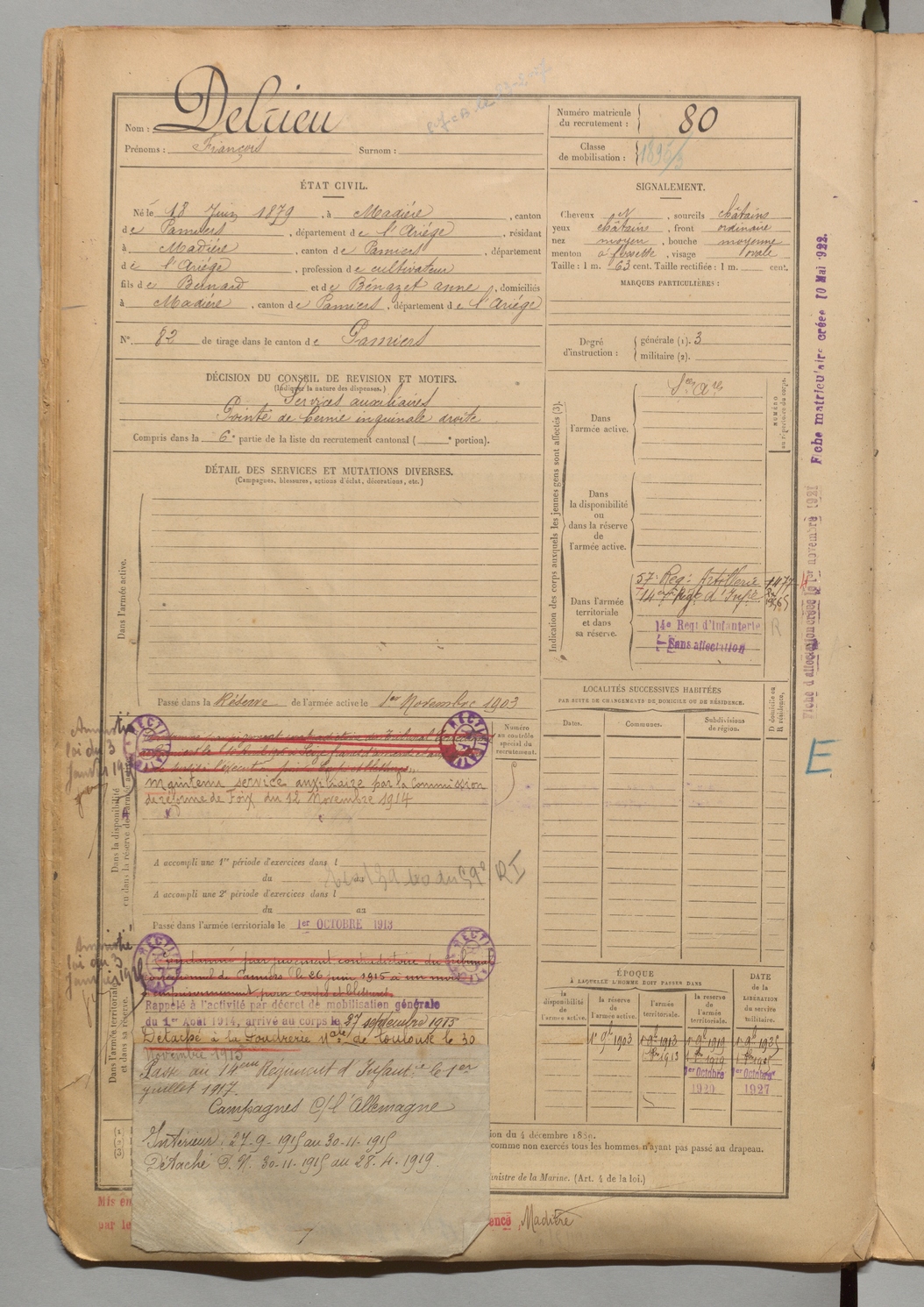 | Delrieu | François | FOIX | 1 R 456 | 1899 | Madières | Madières | 80 |