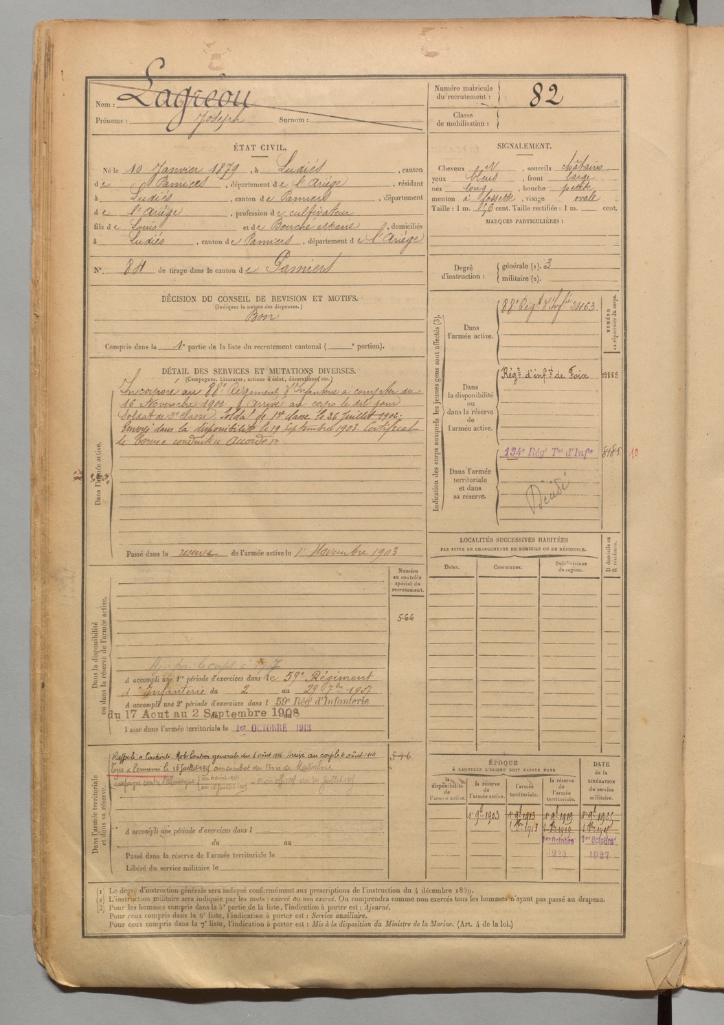 | Lagréou | Joseph | FOIX | 1 R 456 | 1899 | Ludiès | Ludiès | 82 |