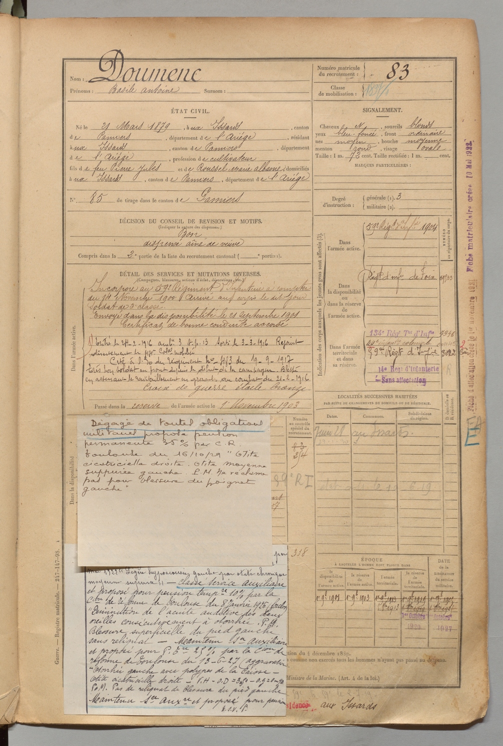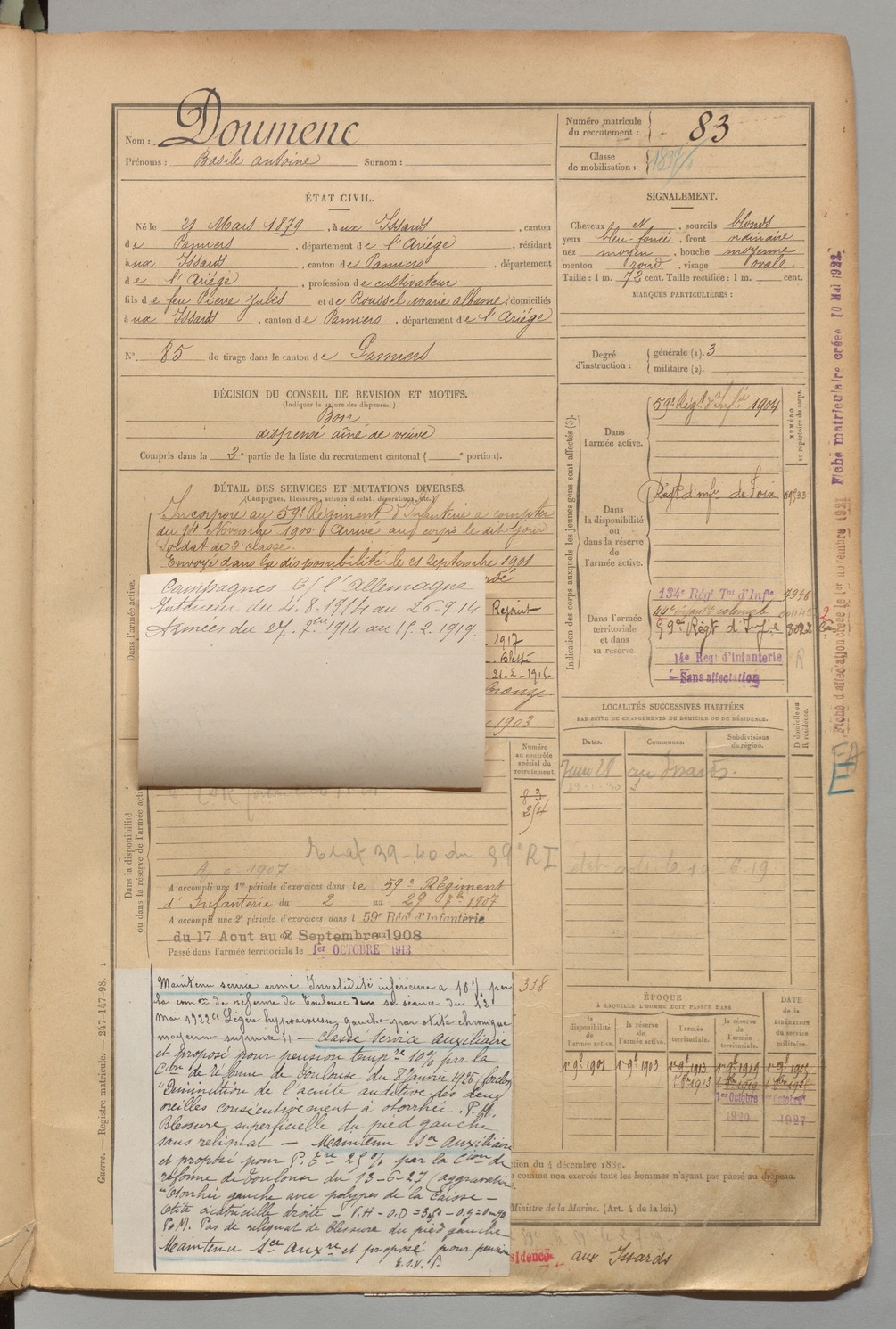 | Doumenc | Basile Antoine | FOIX | 1 R 456 | 1899 | Issards (Les) | Issards (Les) | 83 |