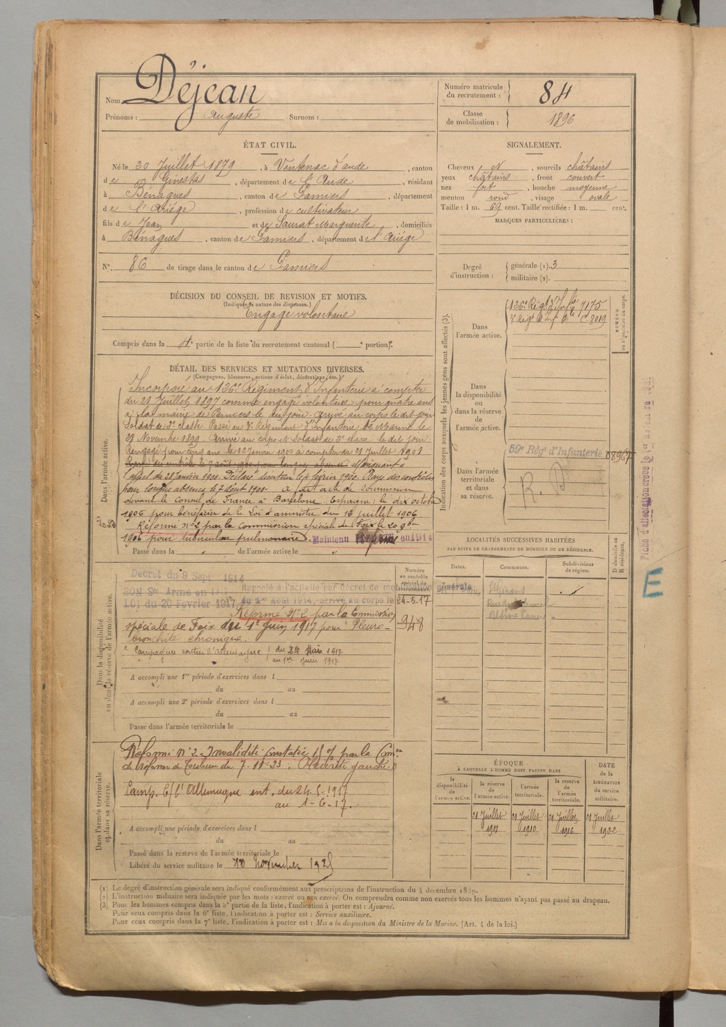 | Déjean | Auguste | FOIX | 1 R 456 | 1899 | Ventenac d' Aude | Bénagues | 84 |
