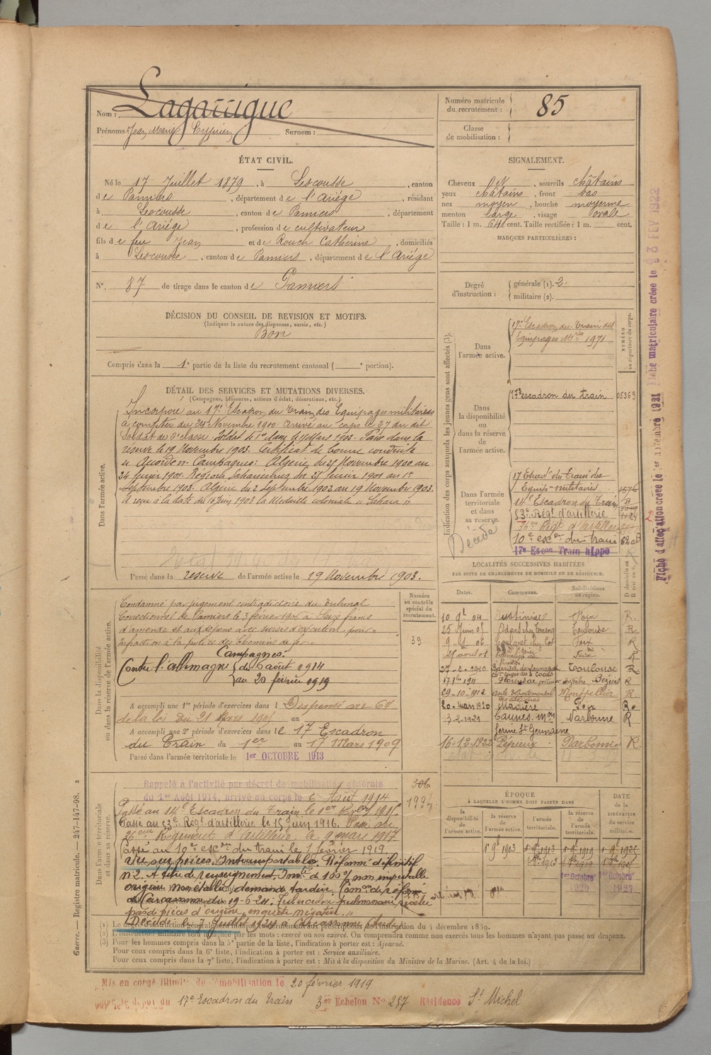 | Lagarrigue | Jean Marie Cyprien | FOIX | 1 R 456 | 1899 | Lescousse | Lescousse | 85 |