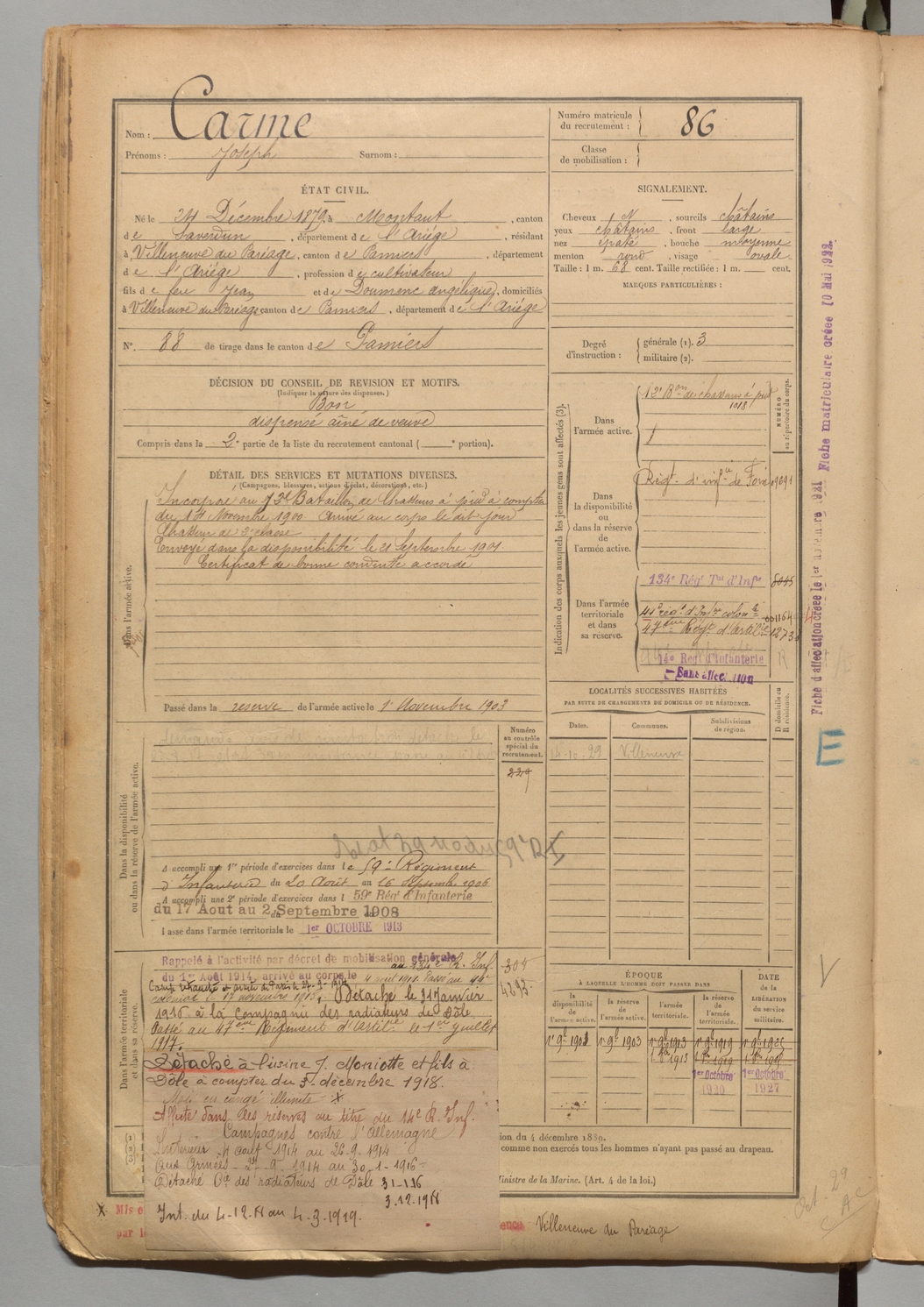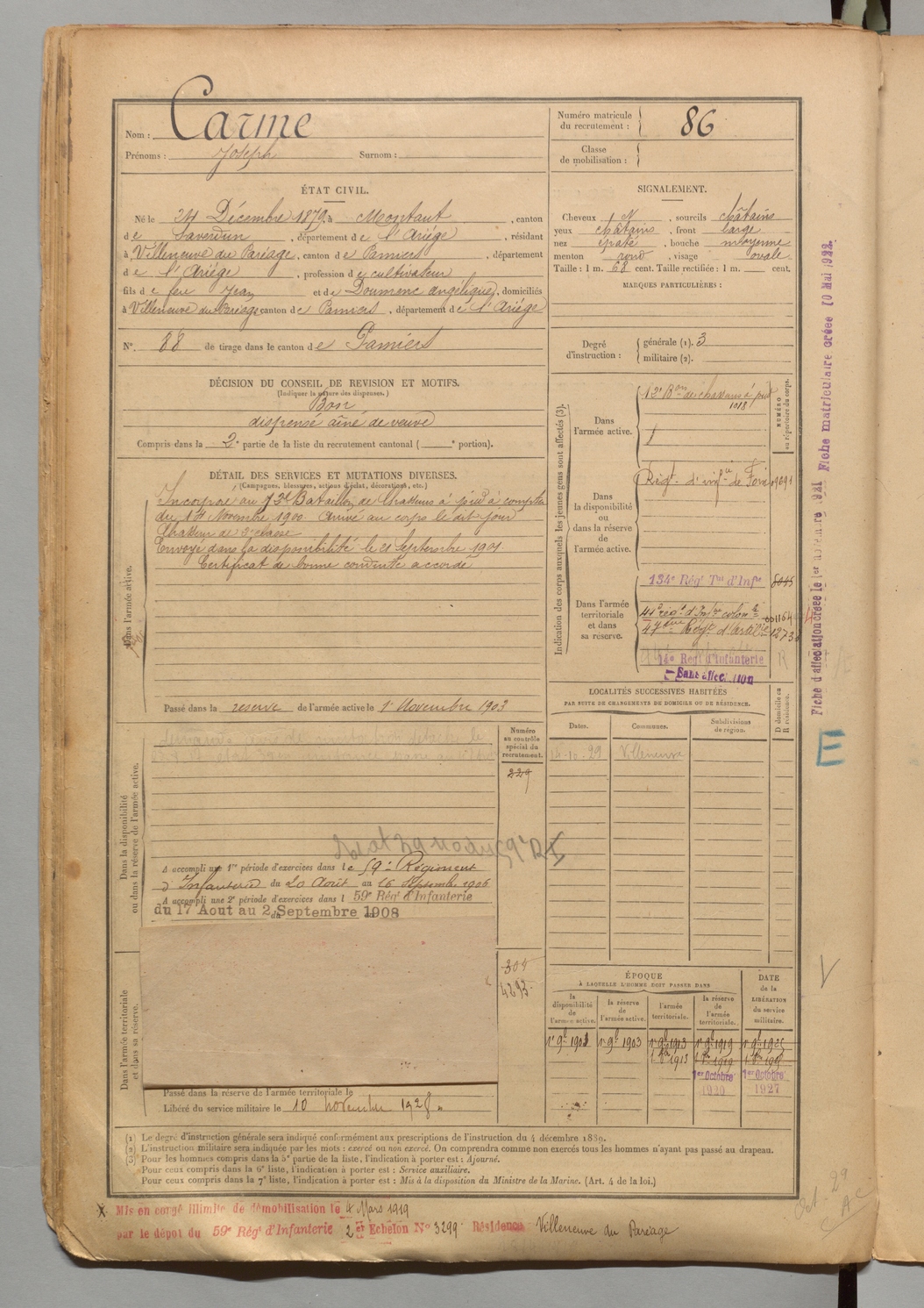 | Carme | Joseph | FOIX | 1 R 456 | 1899 | Montaut | Villeneuve-du-Paréage | 86 |