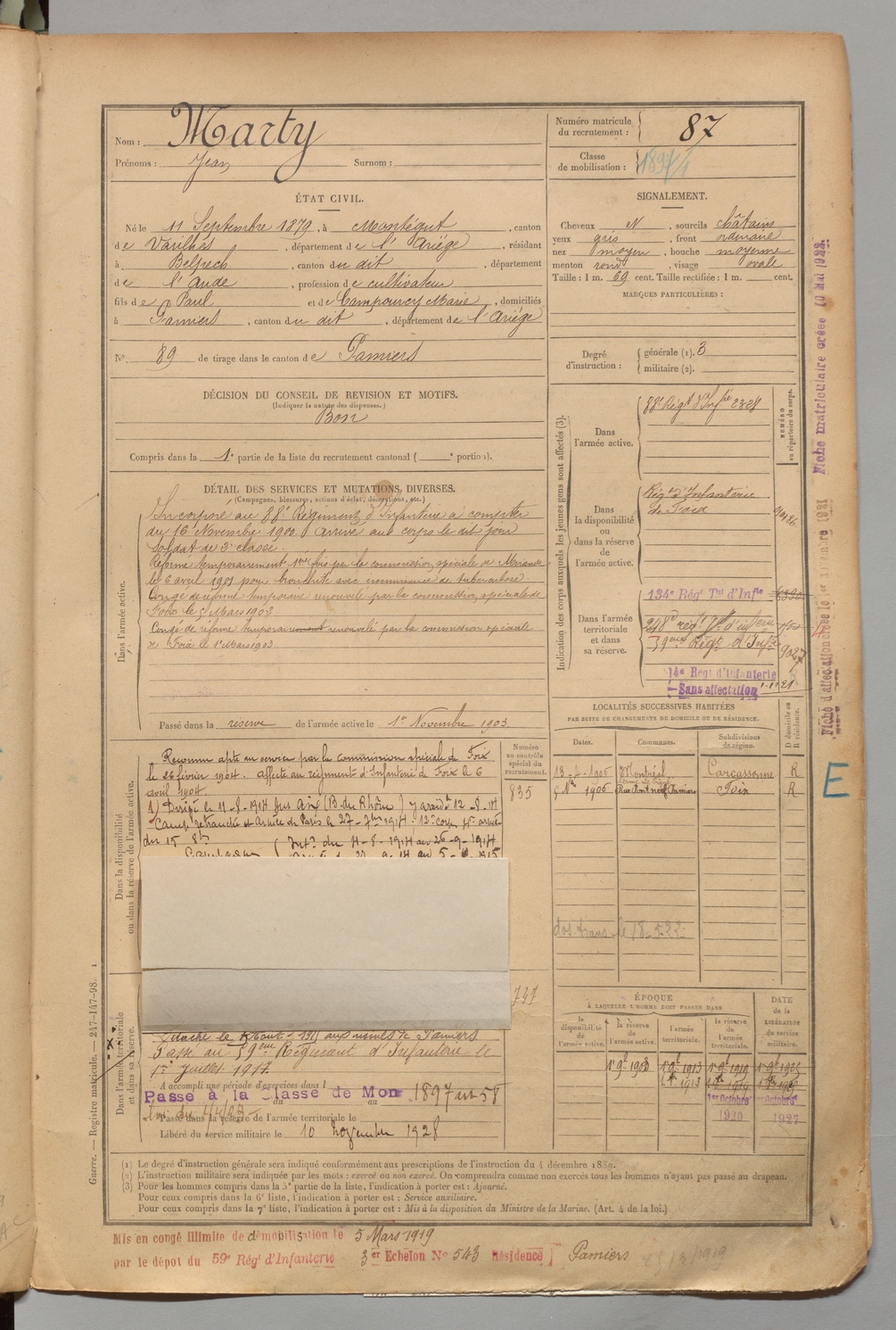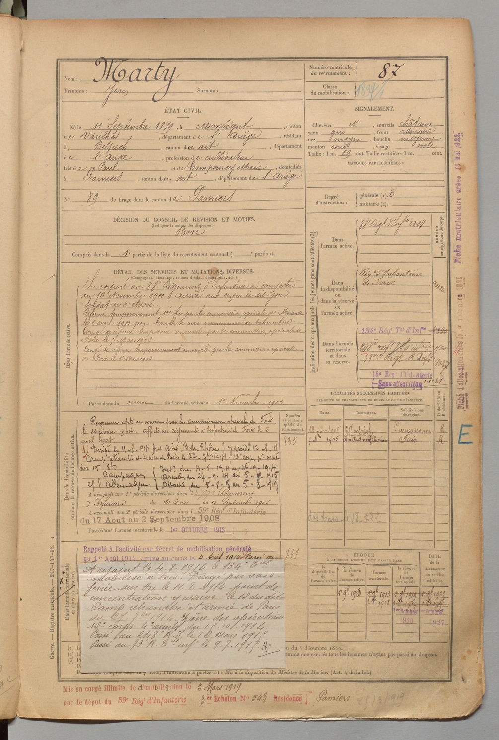 | Marty | Jean | FOIX | 1 R 456 | 1899 | Montégut-Plantaurel | Belpech | 87 |