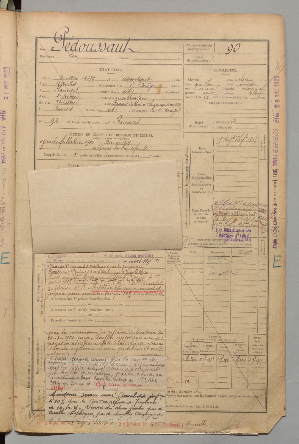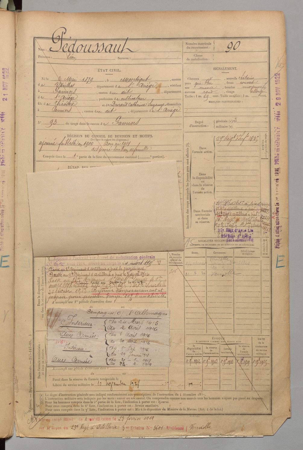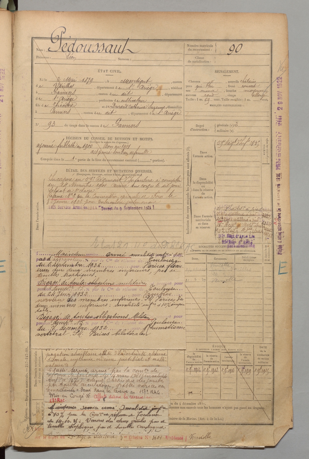| Pédoussaut | Léon | FOIX | 1 R 456 | 1899 | Montégut-Plantaurel | Pamiers | 90 |