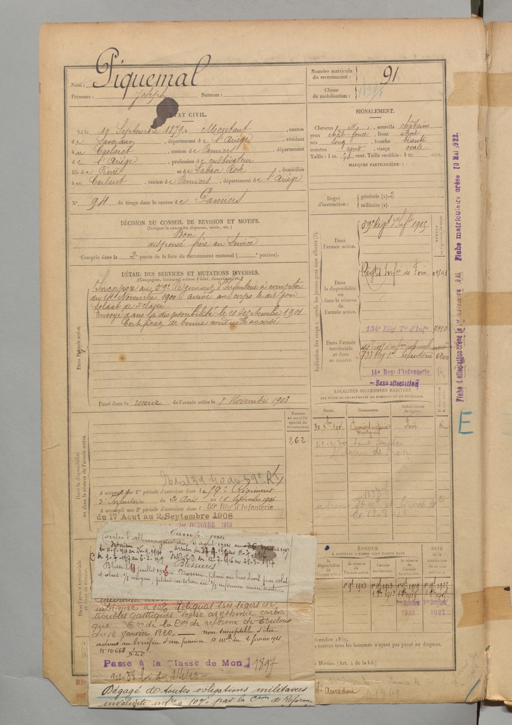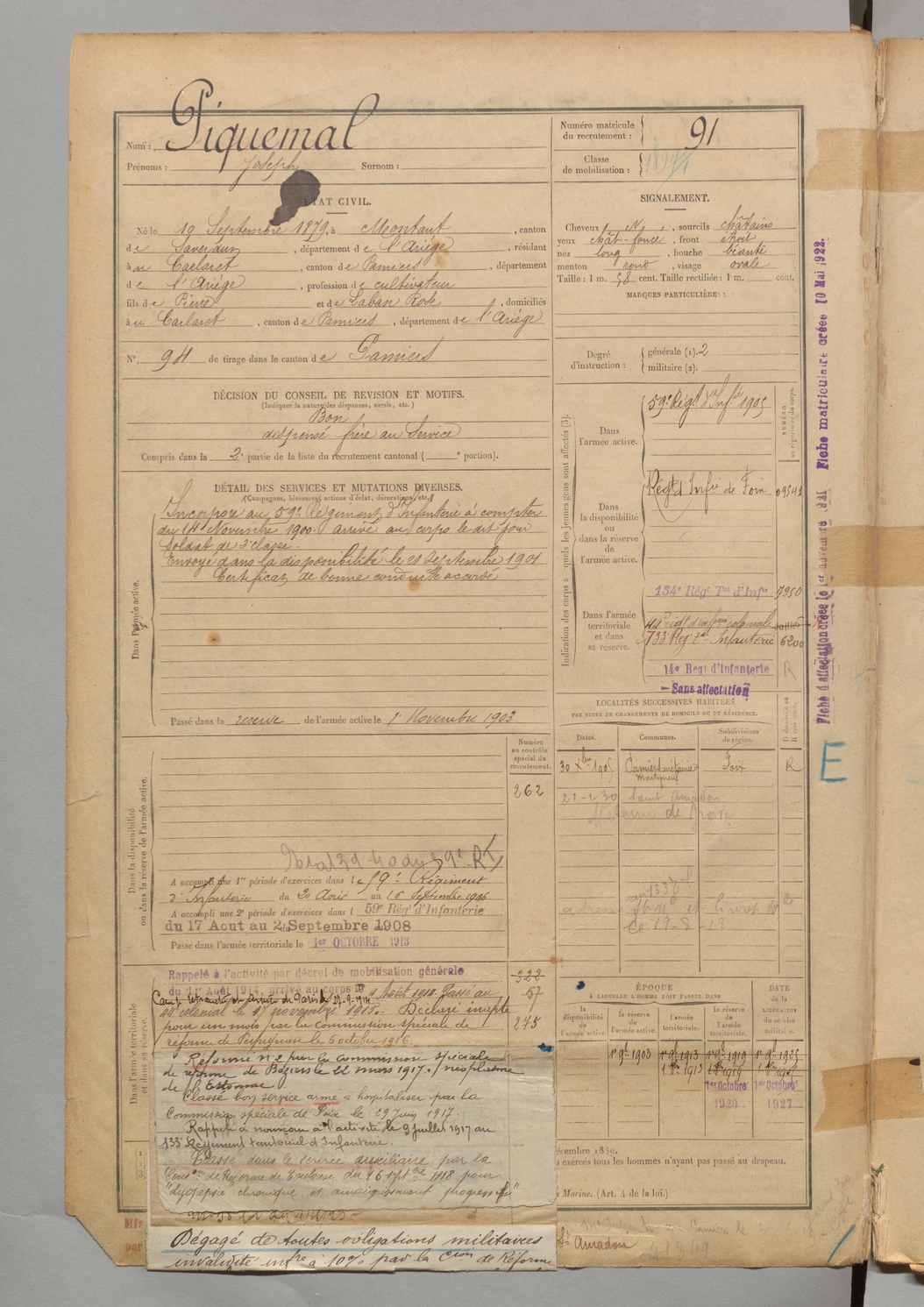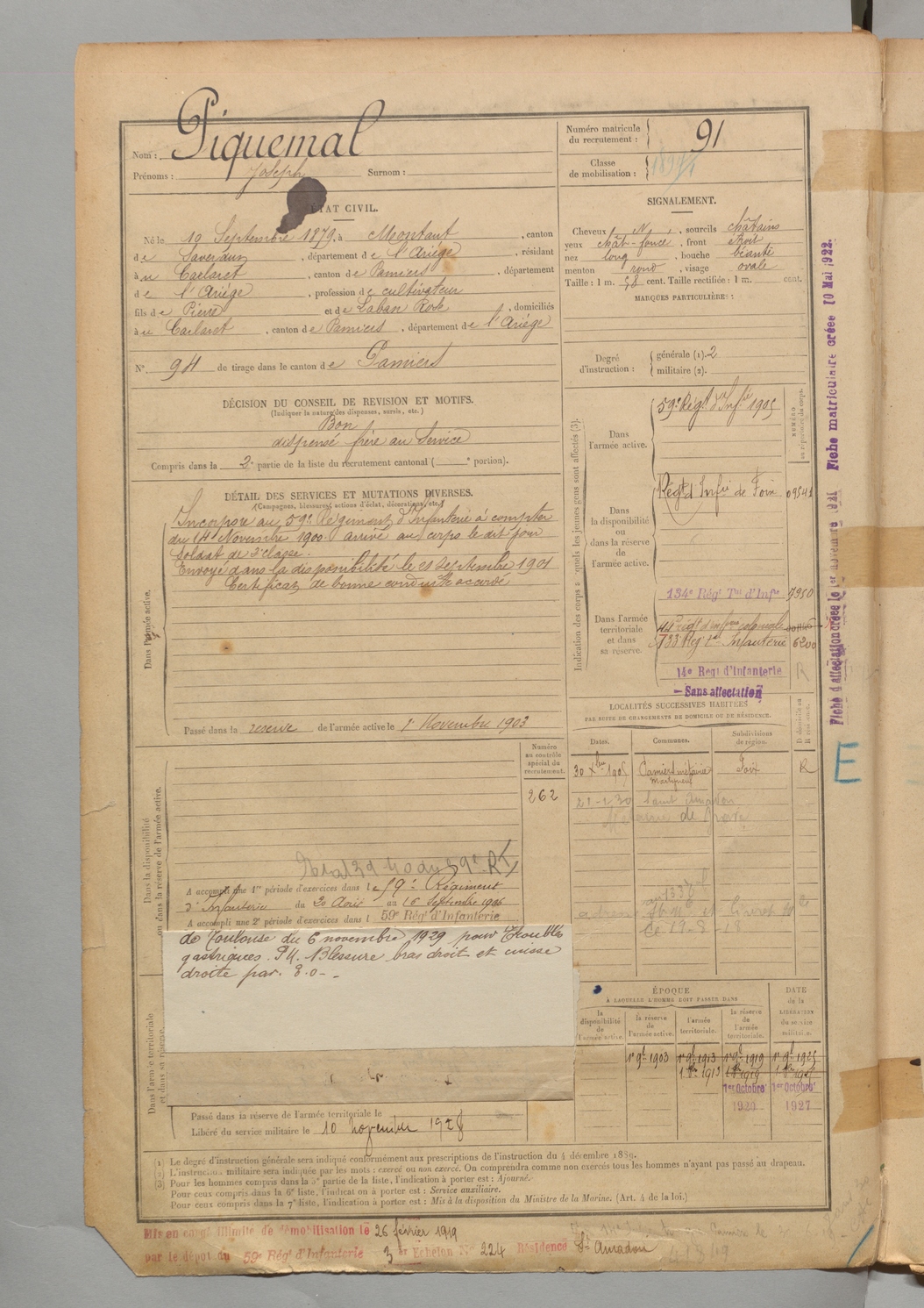 | Piquemal | Joseph | FOIX | 1 R 456 | 1899 | Montaut | Carlaret (Le) | 91 |