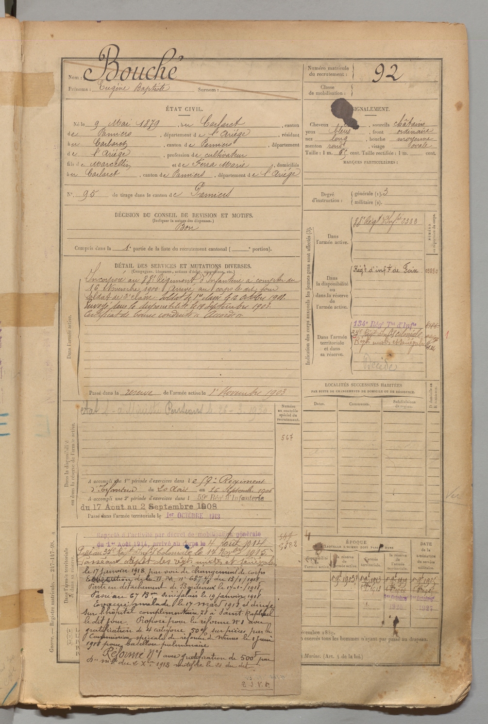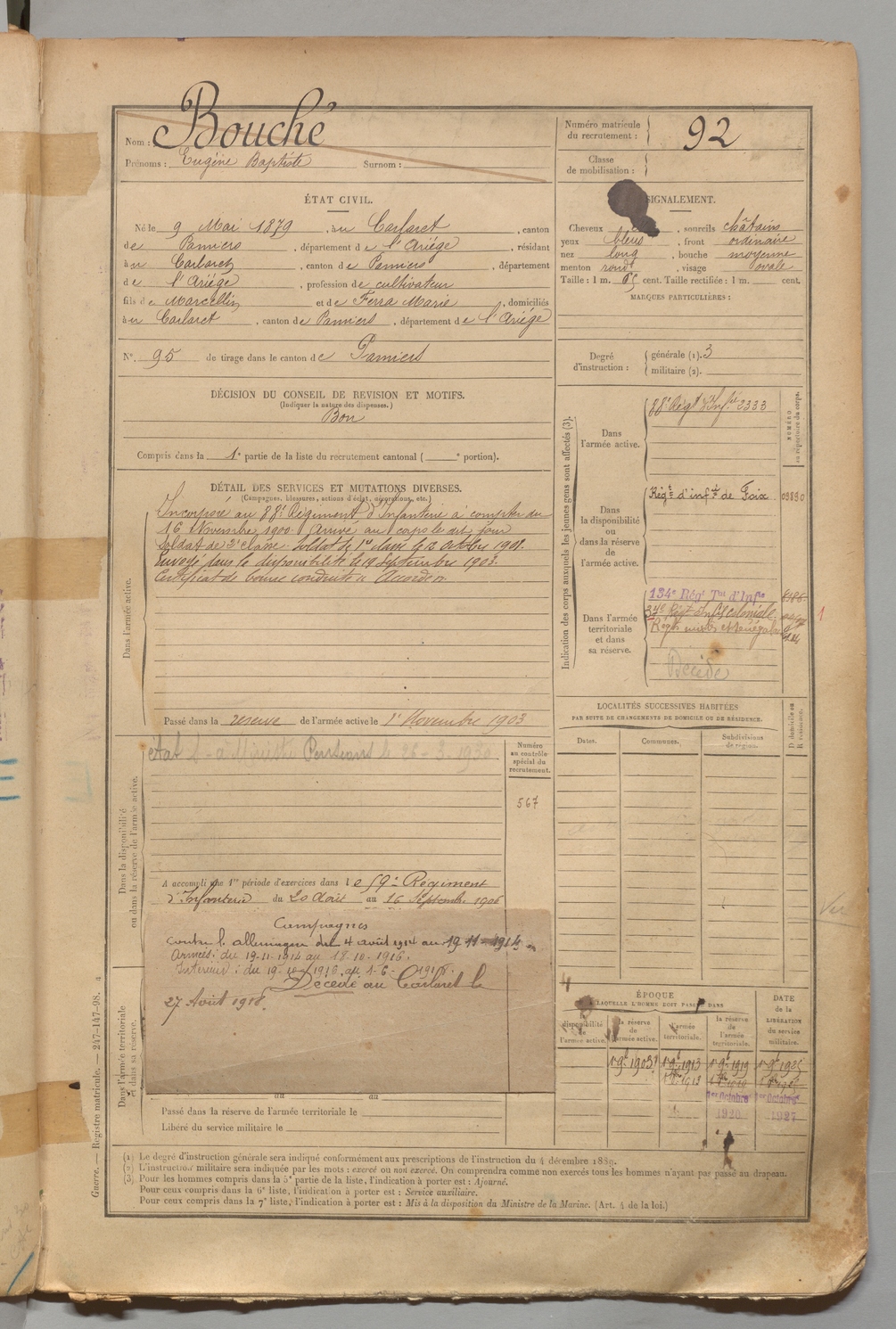 | Bouché | Eugène Baptiste | FOIX | 1 R 456 | 1899 | Carlaret (Le) | Carlaret (Le) | 92 |