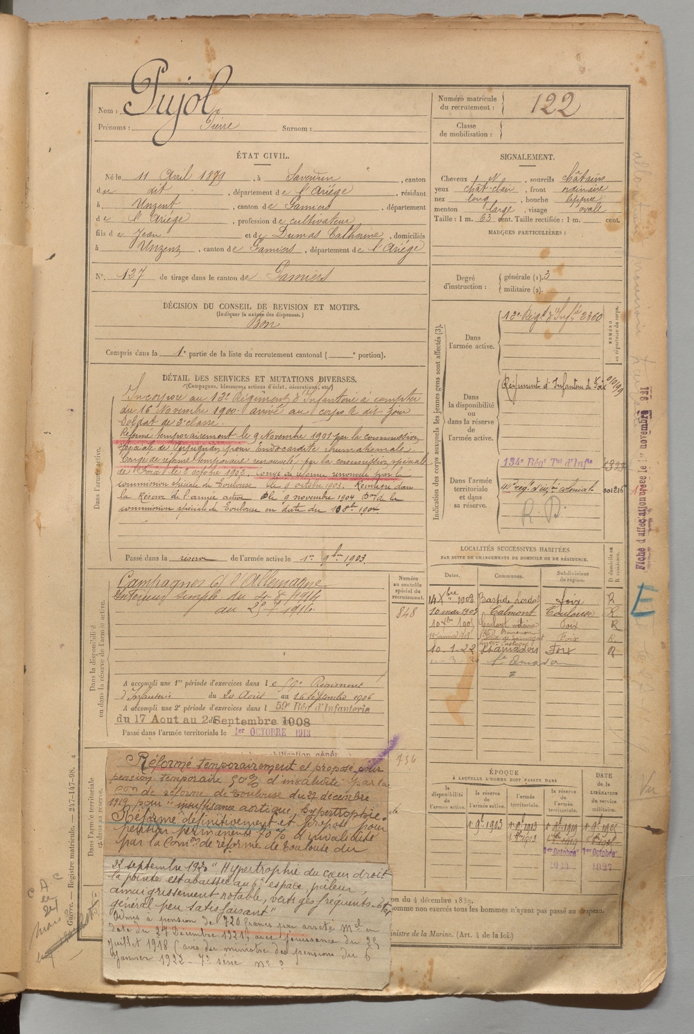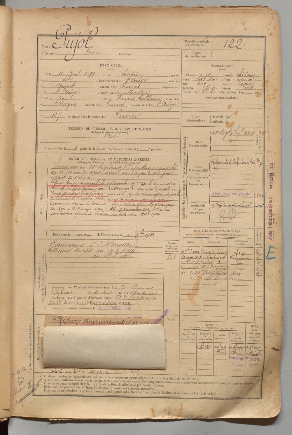 | Pujol | Pierre | FOIX | 1 R 456 | 1899 | Saverdun | Unzent | 122 |