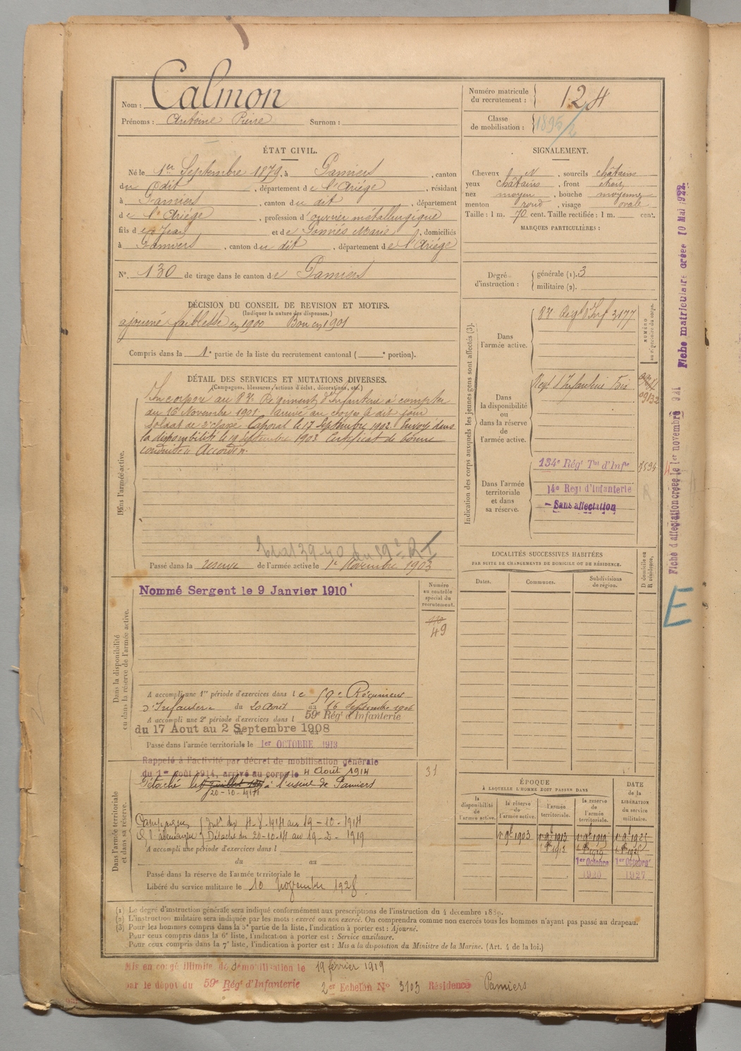 | Calmon | Antoine Pierre | FOIX | 1 R 456 | 1899 | Pamiers | Pamiers | 124 |