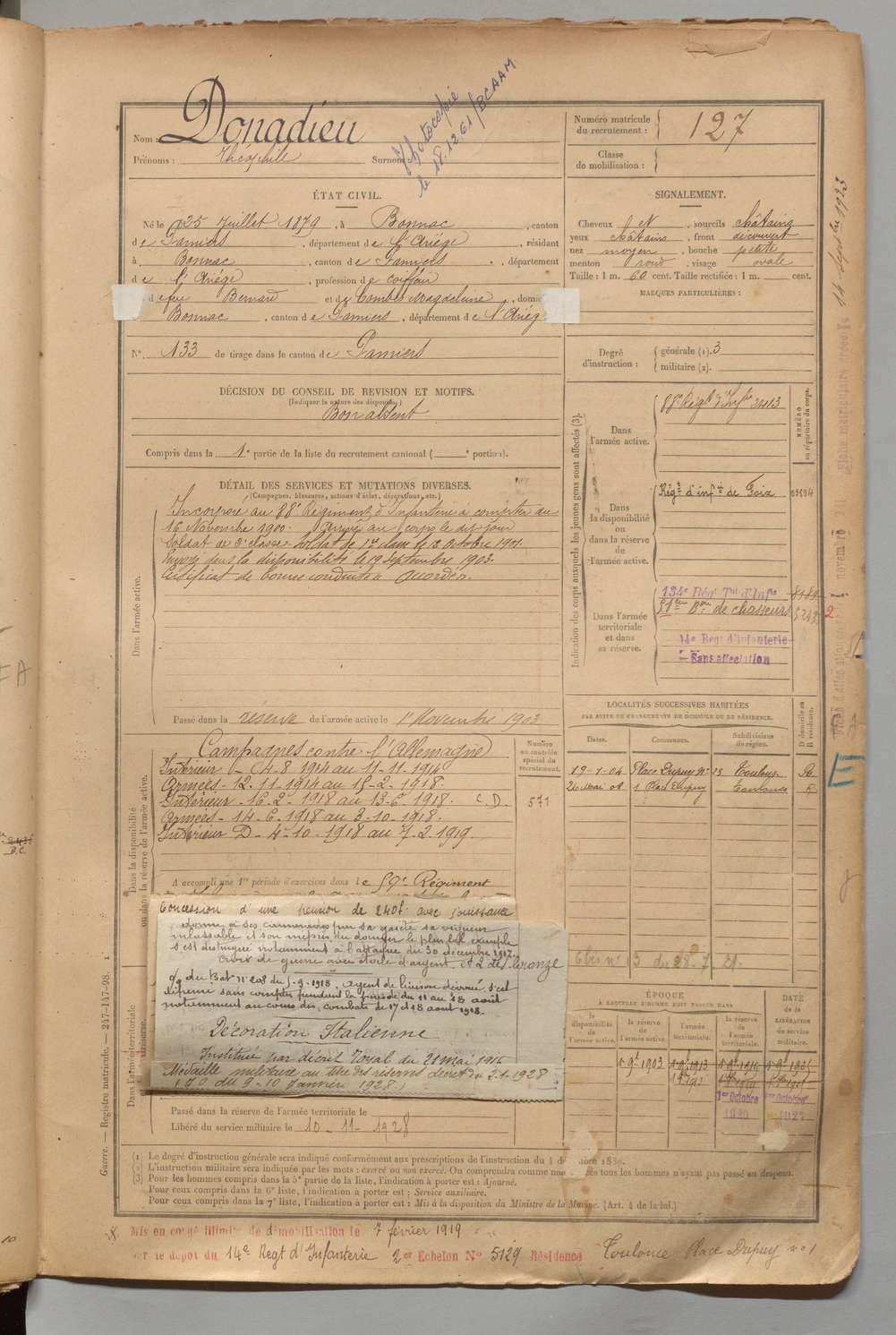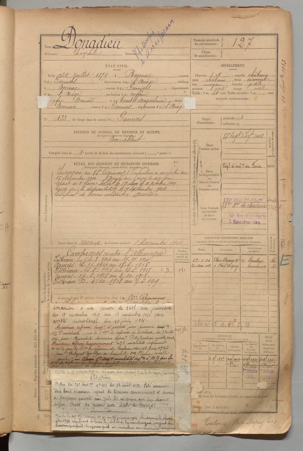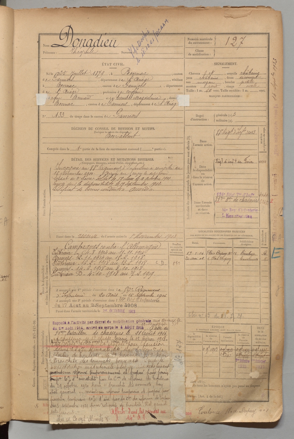 | Donadieu | Théophile | FOIX | 1 R 456 | 1899 | Bonnac | Bonnac | 127 |