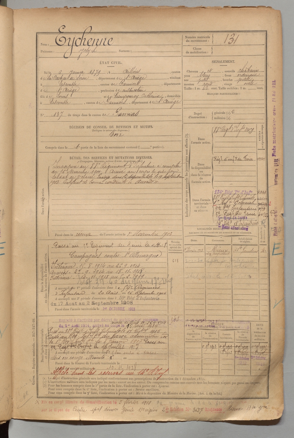 | Eychenne | Joseph | FOIX | 1 R 456 | 1899 | Allières | Lescousse | 131 |